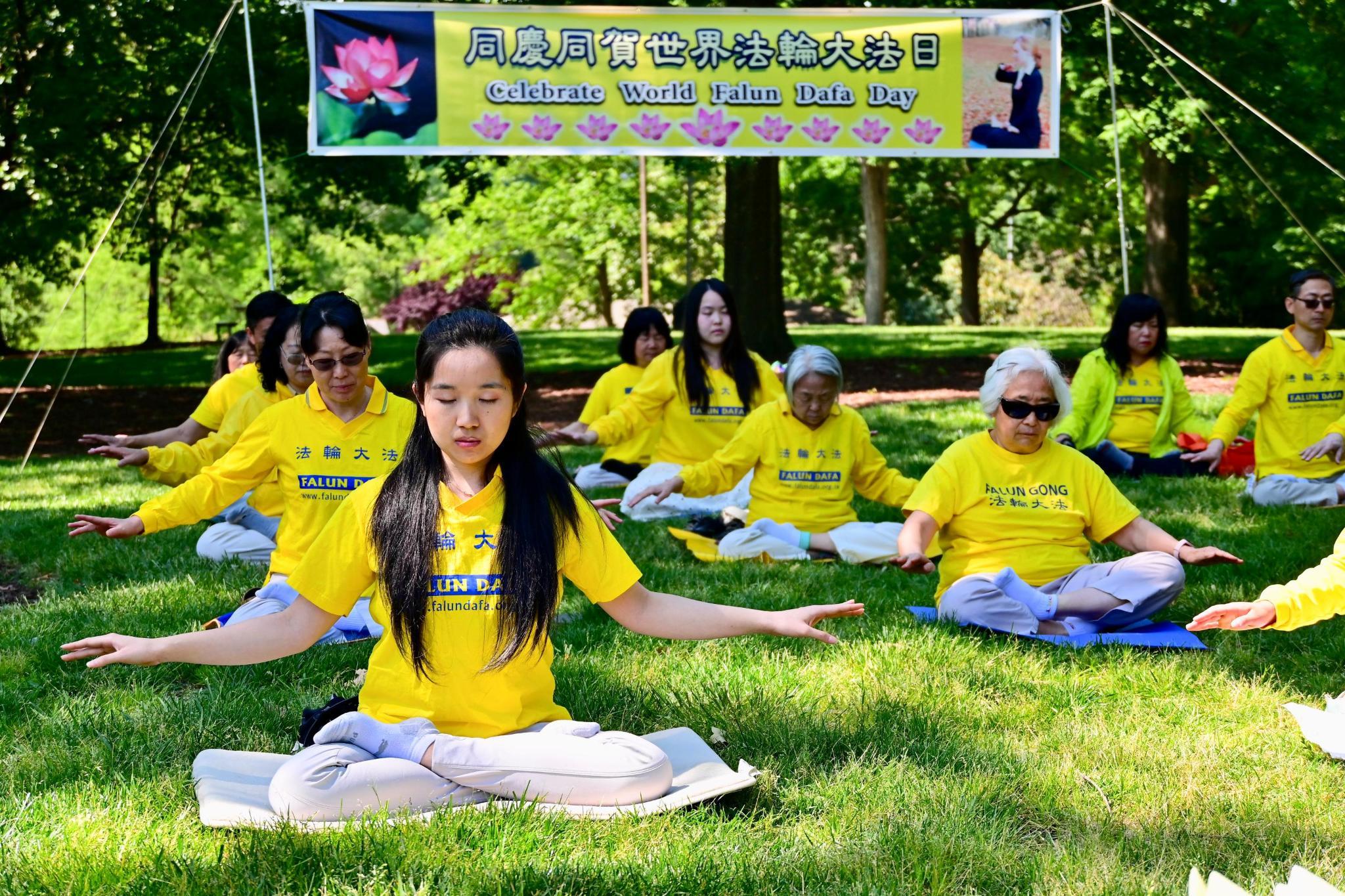 ![]() 图1~2:北卡学员在罗利的普勒公园集体炼功,庆祝法轮大法日。 |