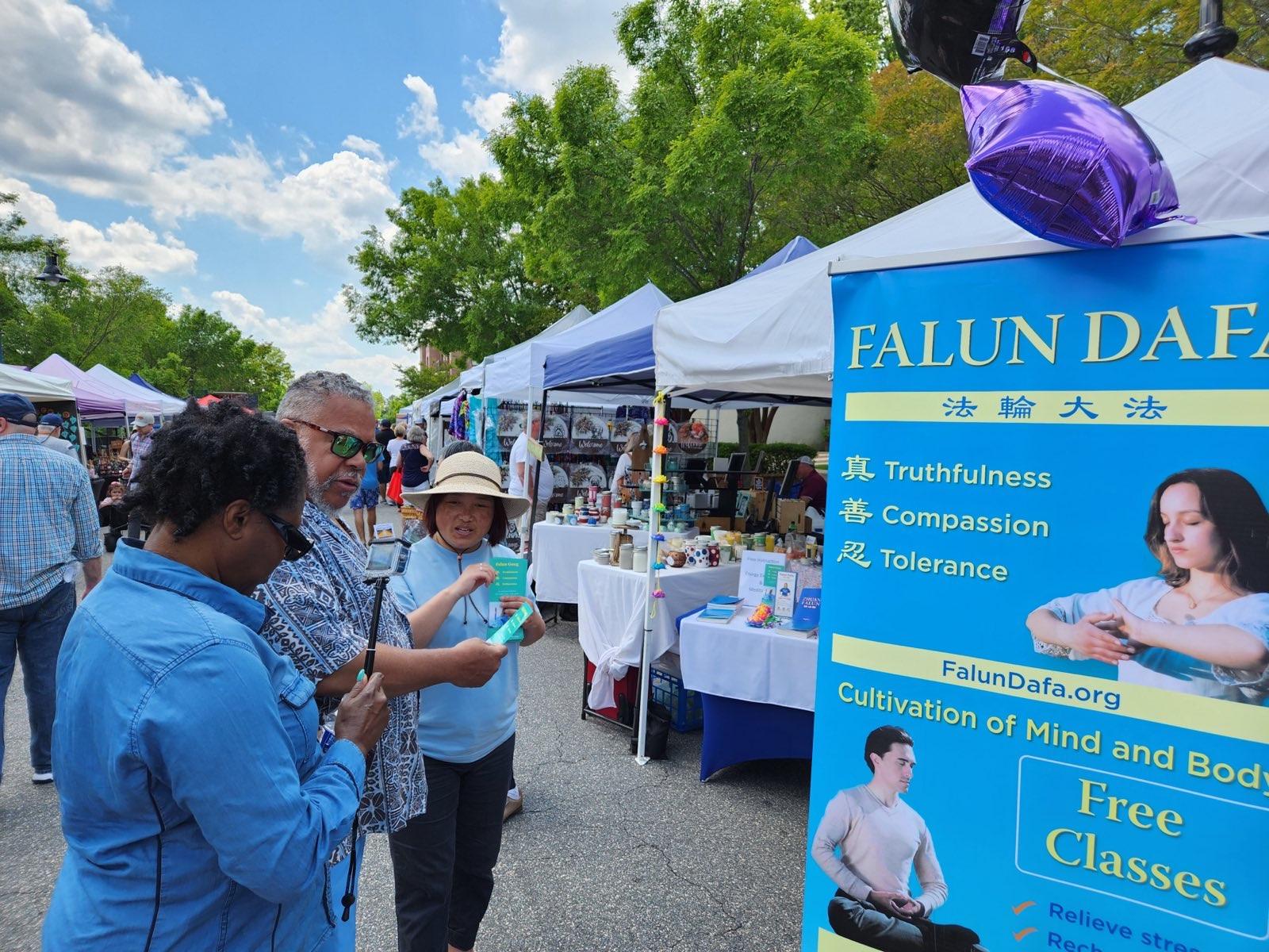 五月六日,部分法轮功学员参加了有近万人参加的北卡维克森林(Wake Forest)市的市区活动,向市民介绍法轮大法。在活动的一百多个展位中,法轮大法的展位总是被很多人驻足,参观。有时整个家庭都会停下来了解真相。法轮功学员们向来自各地的游客、购物者、商贩、学生、老年顾客和儿童,介绍法轮大法,并展示平和的五套功法,发放了很多真相传单。