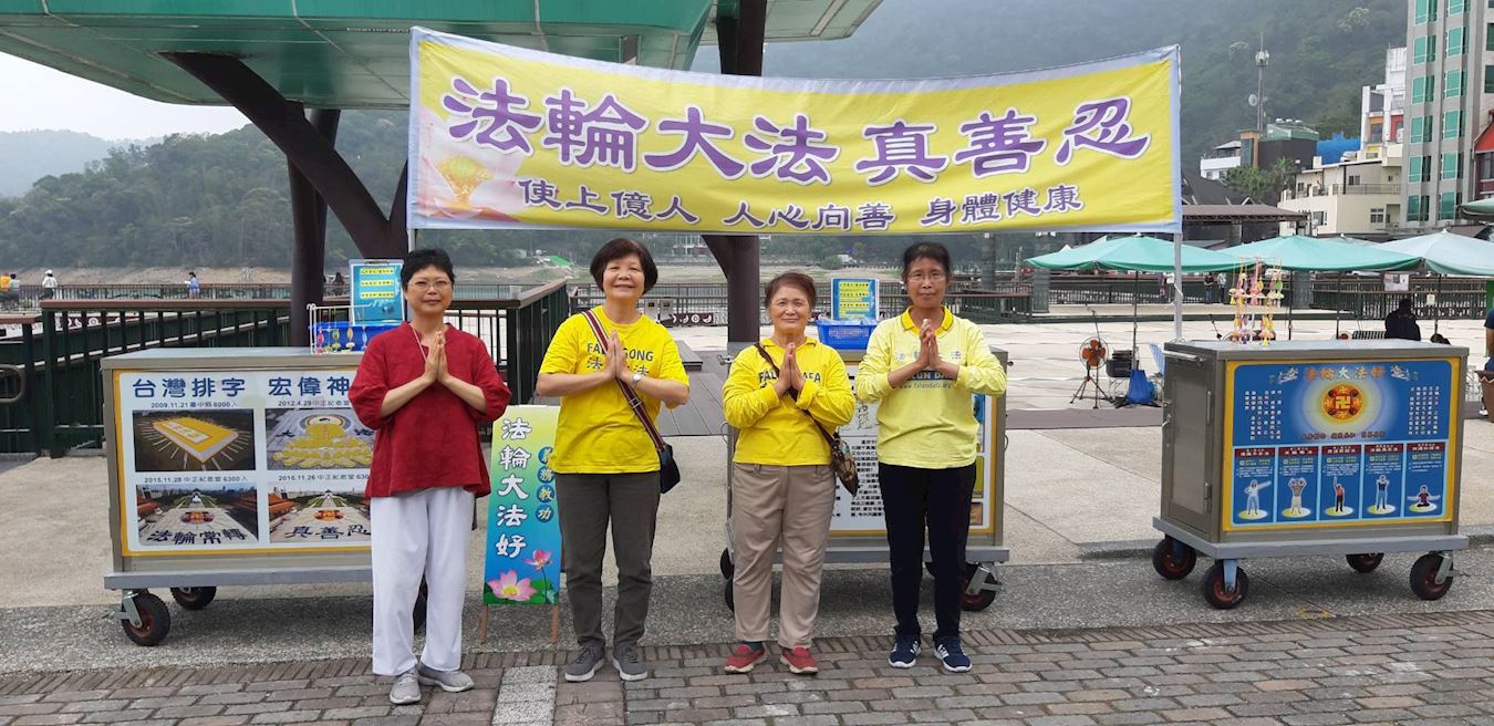 秋月分享十几年来到日月潭讲真相的一些神奇体验,她说,“每星期二都与几位学员固定到日月潭讲真相,无论逢年过节、天气如何刮风下雨,甚至气象报导台风将来台湾(最后台风都转向到其他地方去了),这些都无法动摇我们前去讲真相的心,很特别的是,我们几乎很少遇到下雨被雨淋湿的情况。”