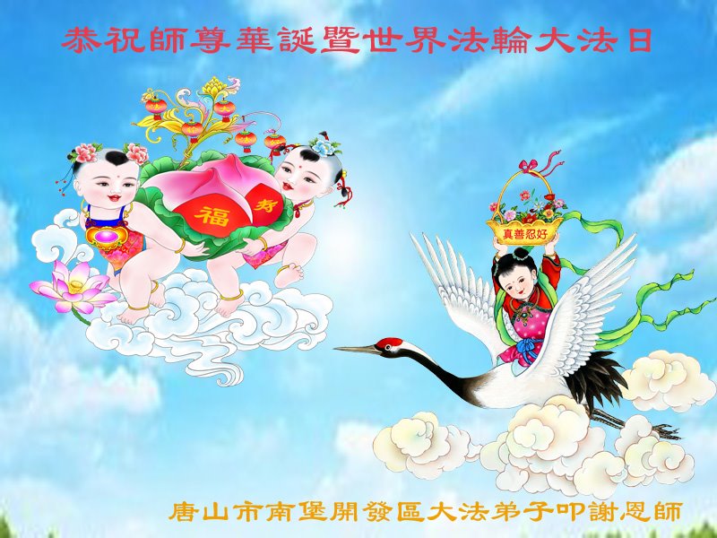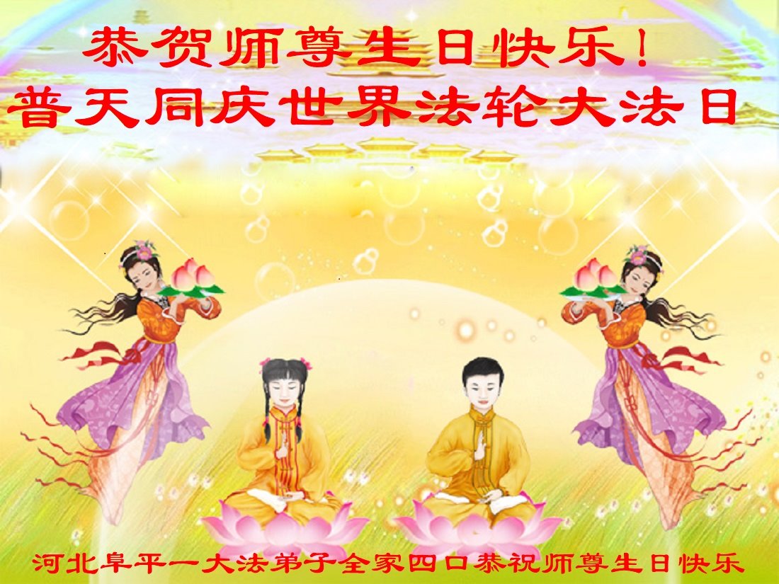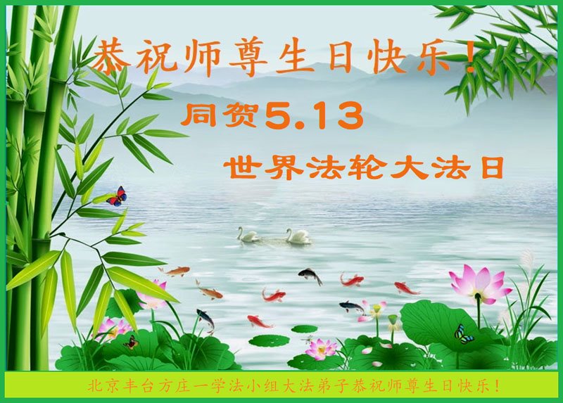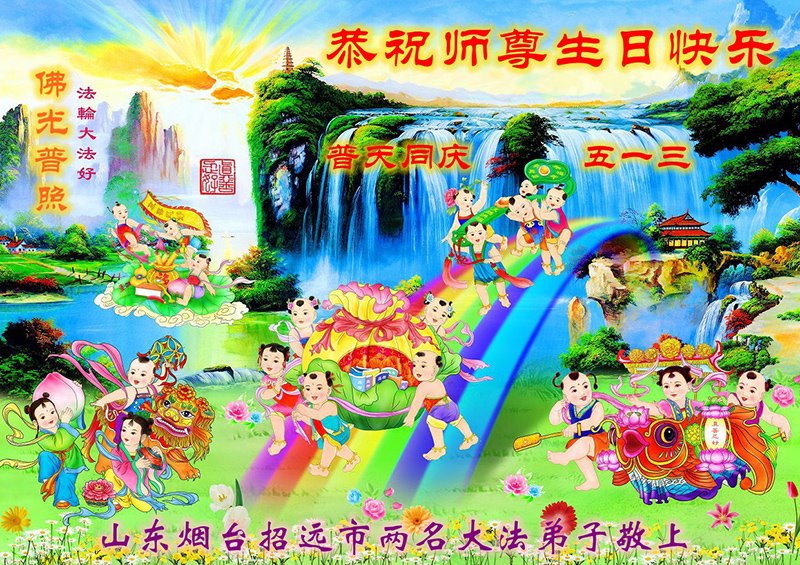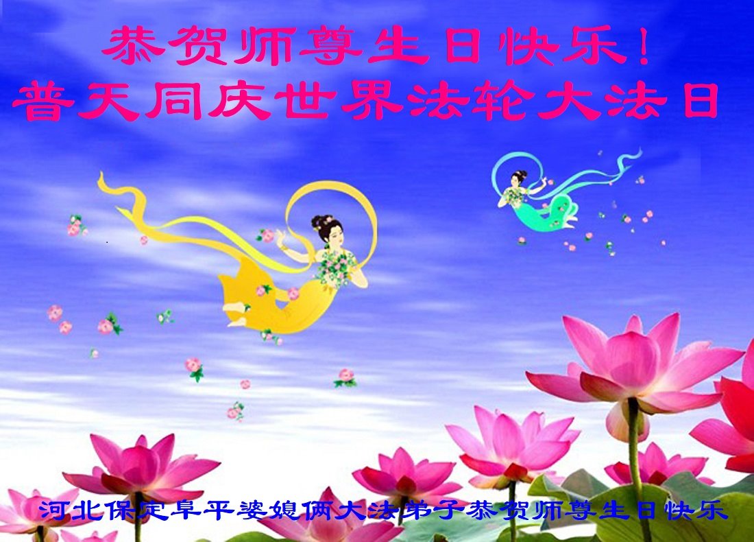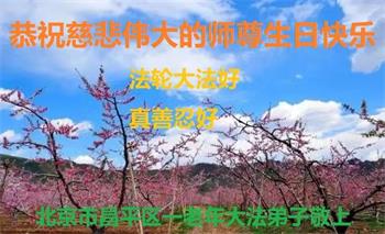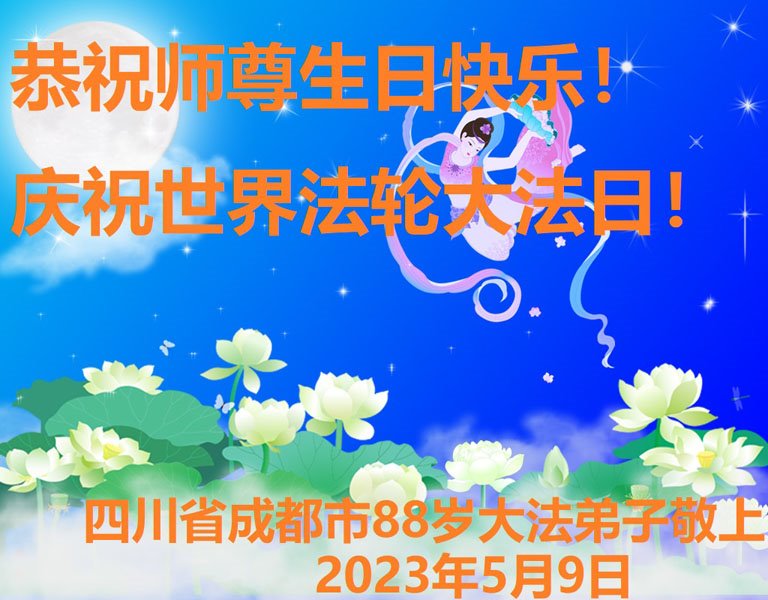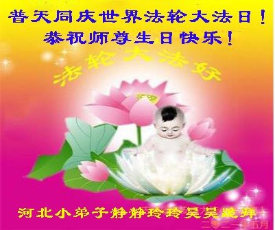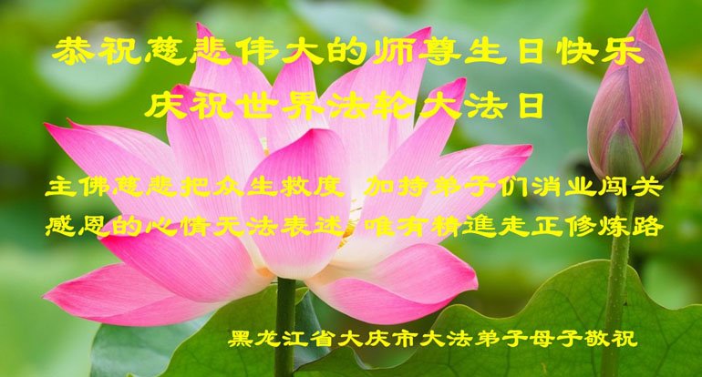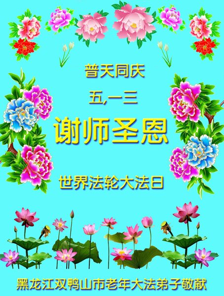 在普天同庆世界法轮大法日的殊胜日子里,我们俩老年大法弟子真诚的问声:师尊好!恭祝师尊生日快乐!感恩师尊慈悲救度!