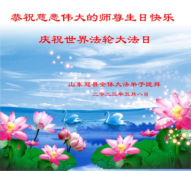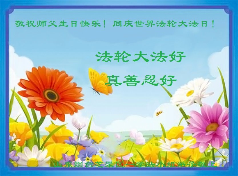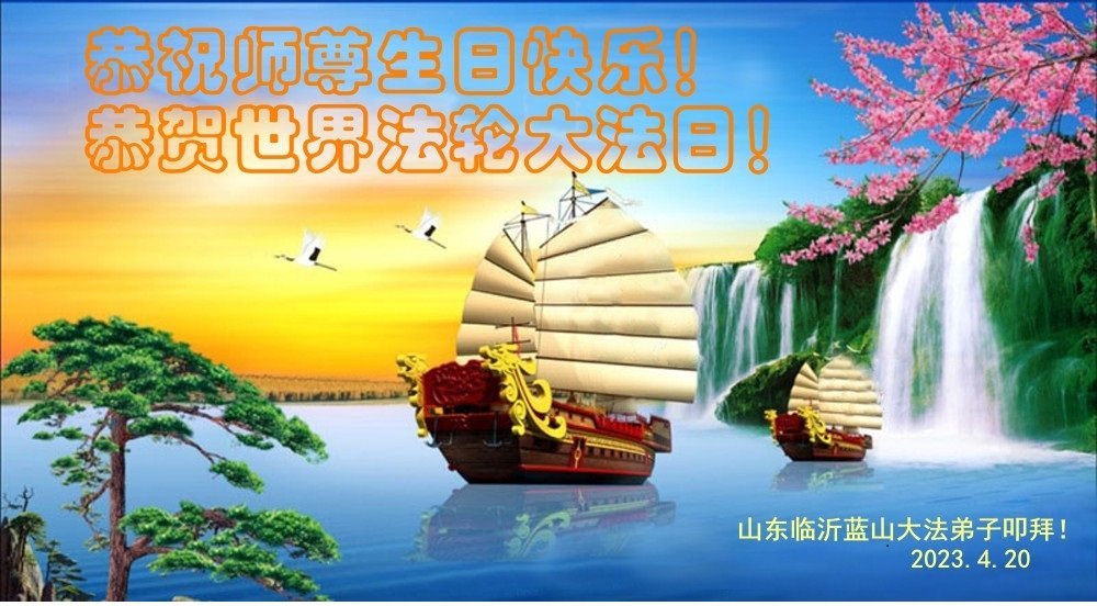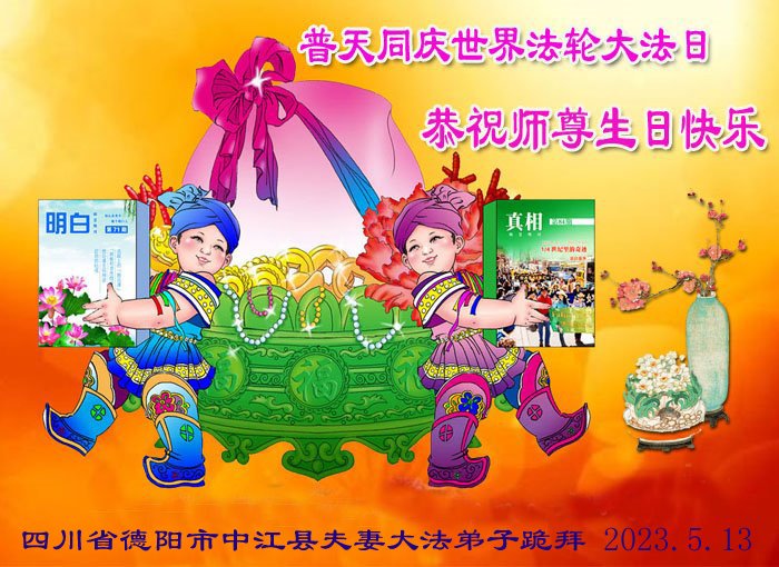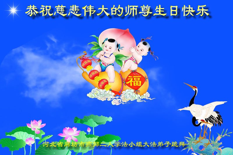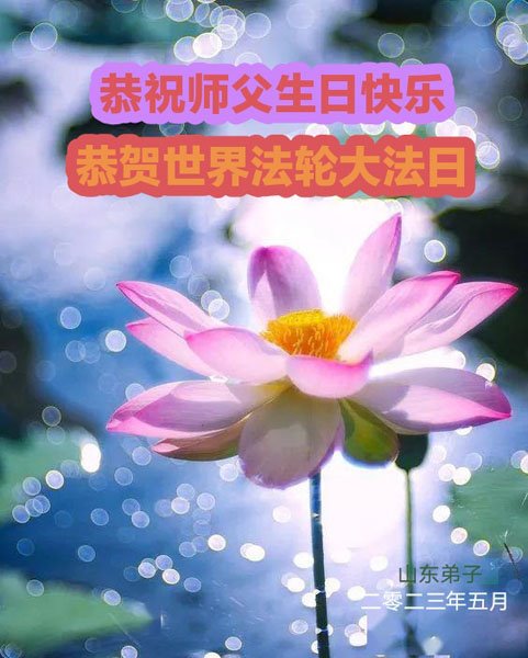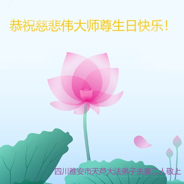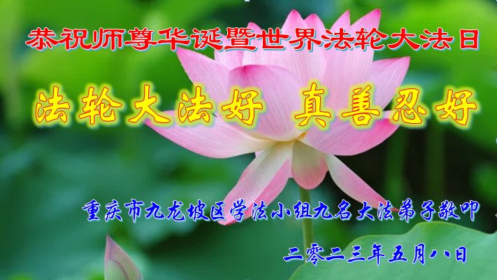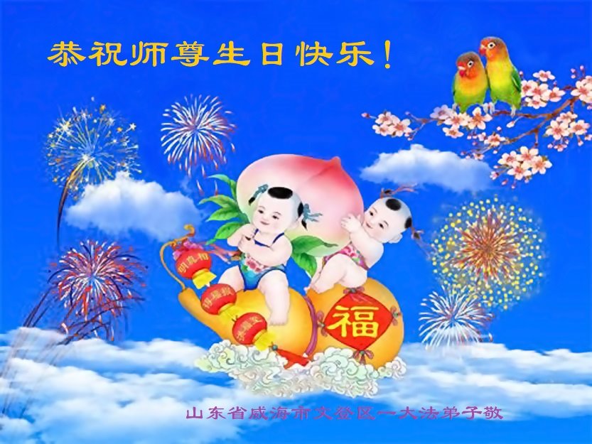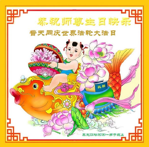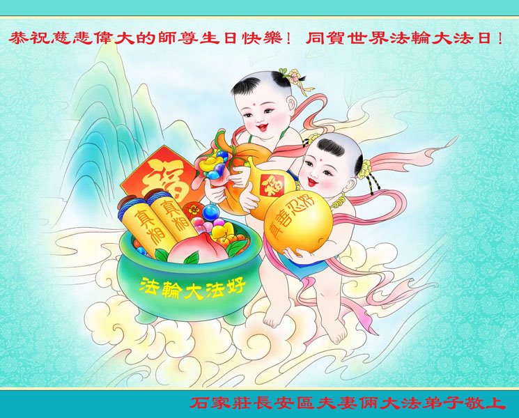 在普天同庆世界法轮大法日的殊胜日子里,我们俩老年大法弟子真诚的问声:师尊好!恭祝师尊生日快乐!感恩师尊慈悲救度!