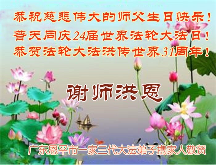 广东省恩平市一大法弟子与子女、孙子大法弟子携家人叩谢师父洪恩!