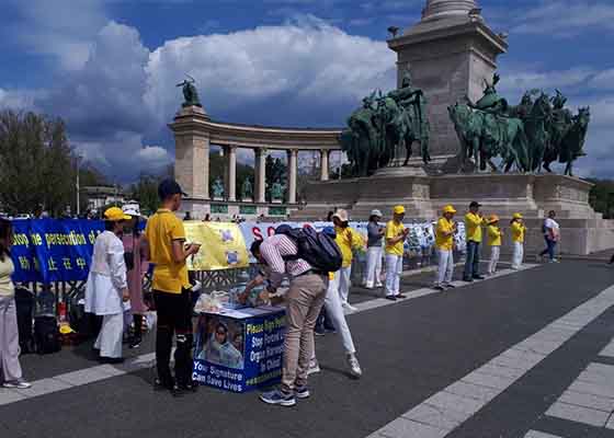 五月七日,匈牙利的部份法轮功学员在首都布达佩斯的英雄广场庆祝世界法轮大法日,传播法轮功的美好及其真相,并呼吁停止迫害。