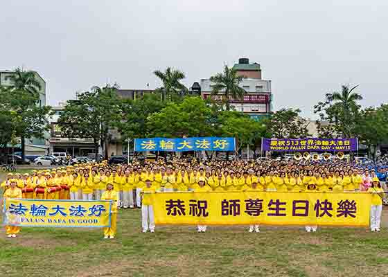 五月一十三日,庆祝世界法轮大法日,台湾嘉义法轮功学员集体炼功弘法,讲法轮功真相,市民感谢学员传播真相,赞许道:法轮功学员都很善良。