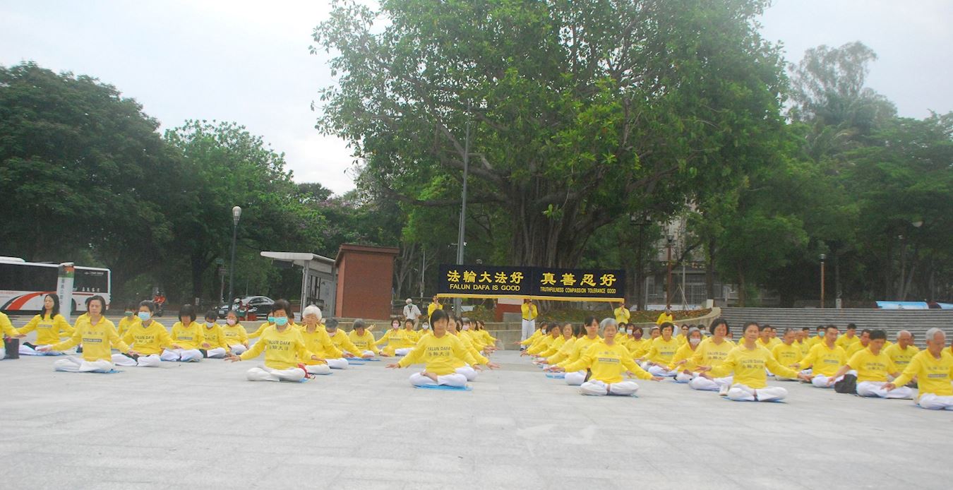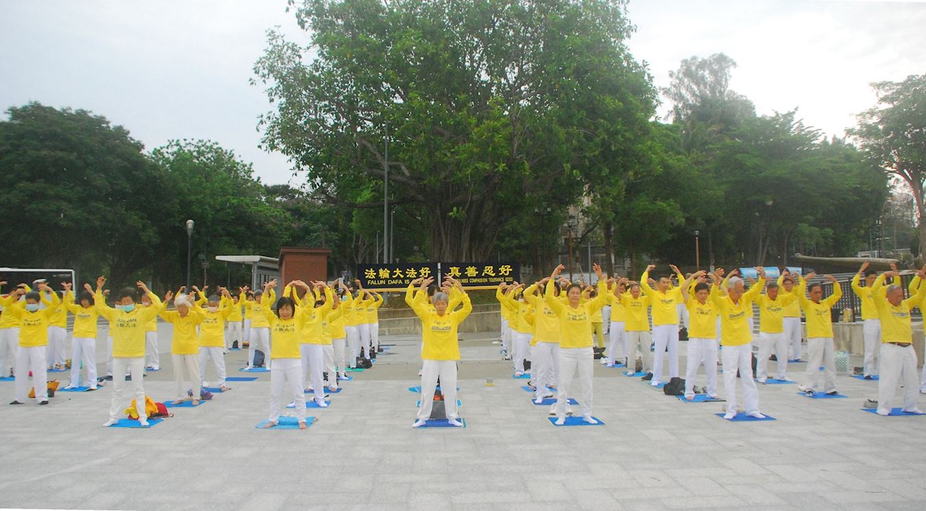 '图1~3:学员在嘉义市中山公园集体炼功弘法,讲法轮功真相。'