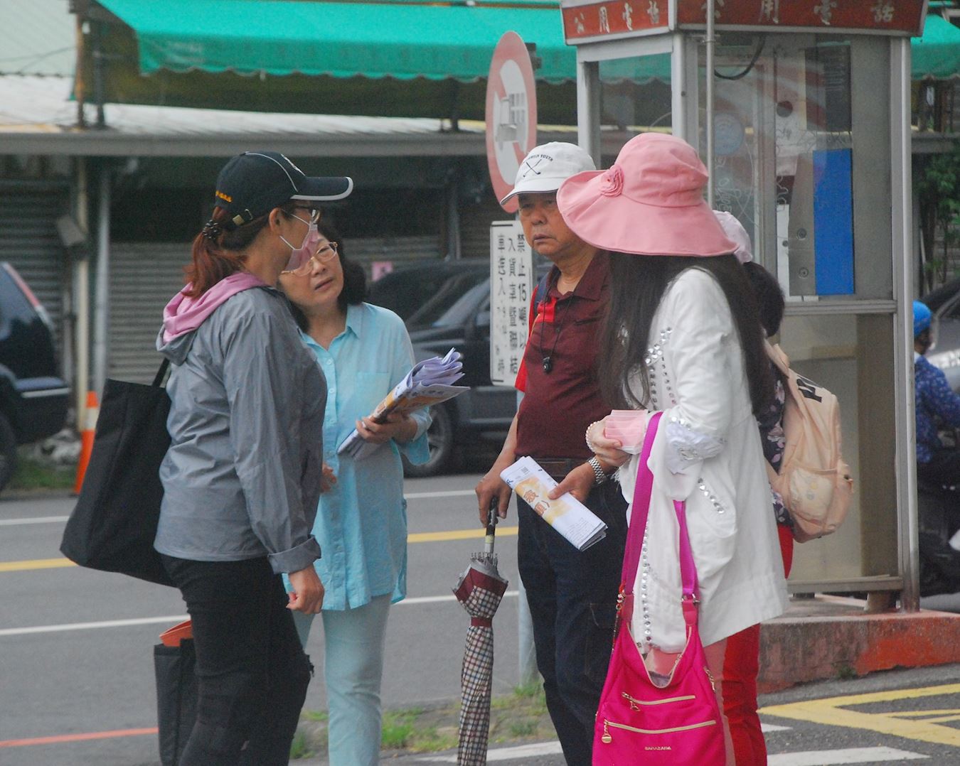 图5:法轮功学员向市民发真相资料,讲真相。