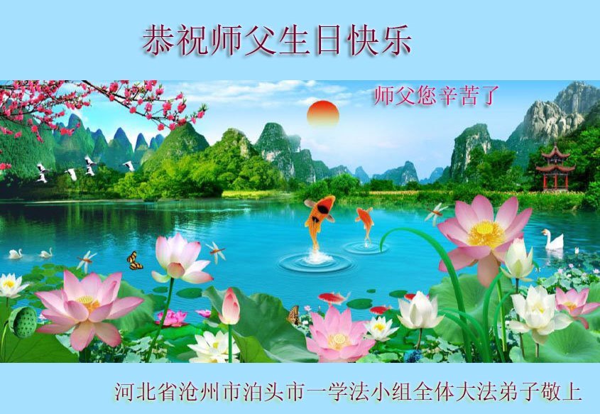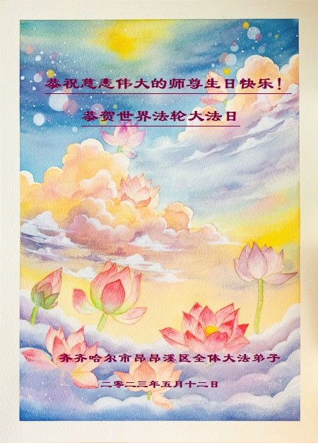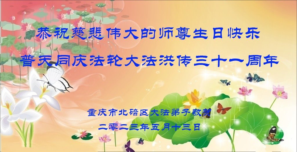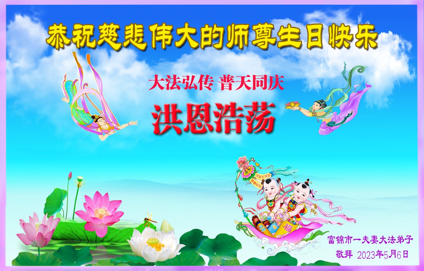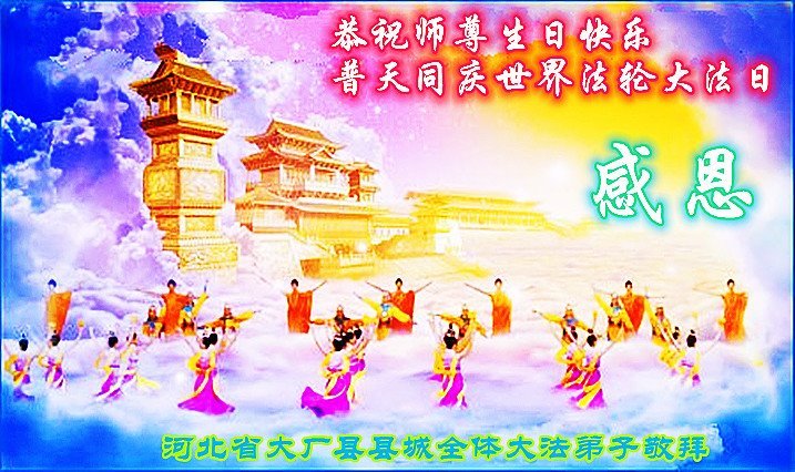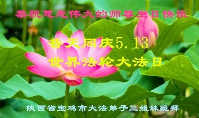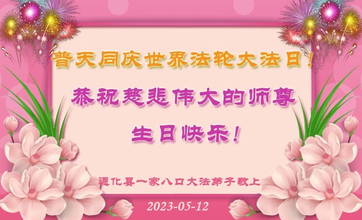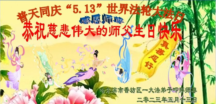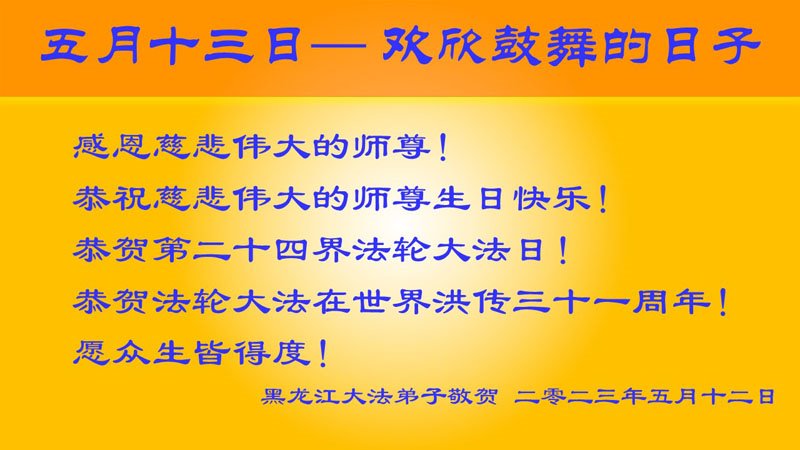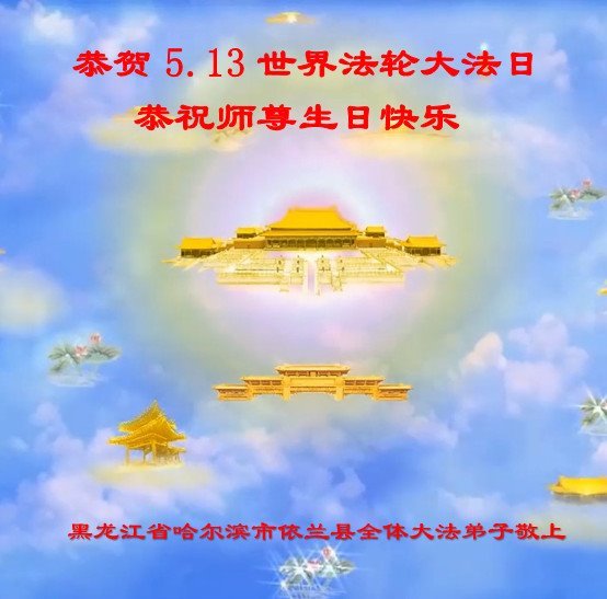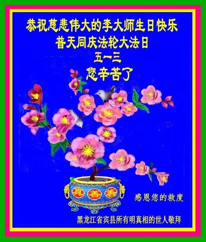 黑龙江省宾县所有明真相众生的肺腑之言与祝愿:五月十三日是普天同庆、隆重而欢庆的节日!不只是大法弟子的节日,也是普天众生的节日!我们怀着无比喜悦的心情,恭祝慈悲伟大的李大师生日快乐!法轮大法日生生不息、万古留传!真诚的问候李大师:您辛苦了!感谢您救度之恩!同时也感激您教的大法弟子!