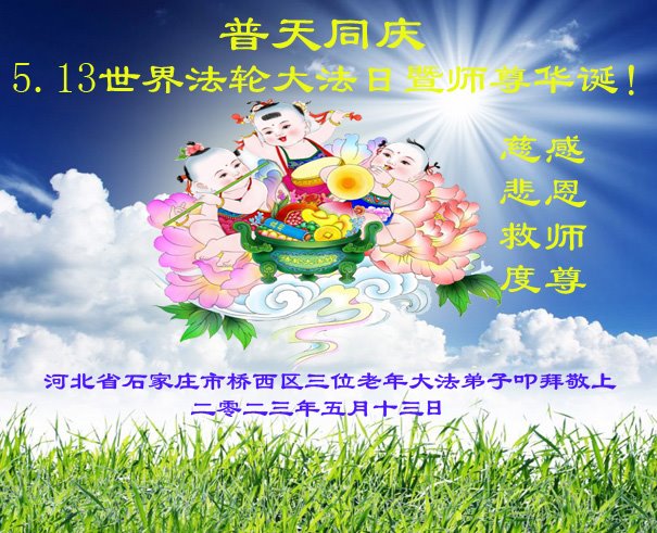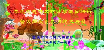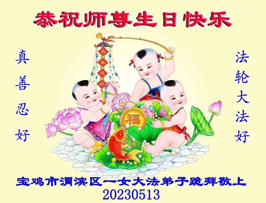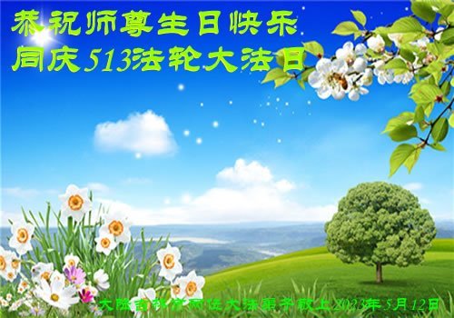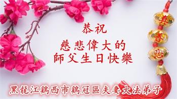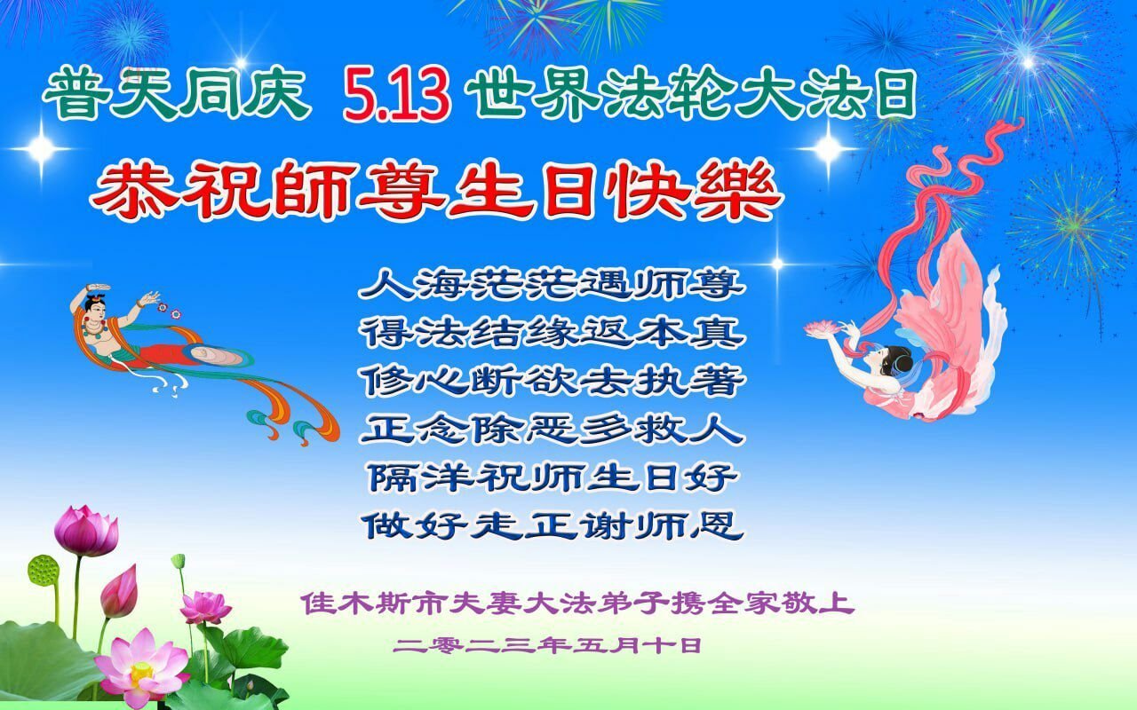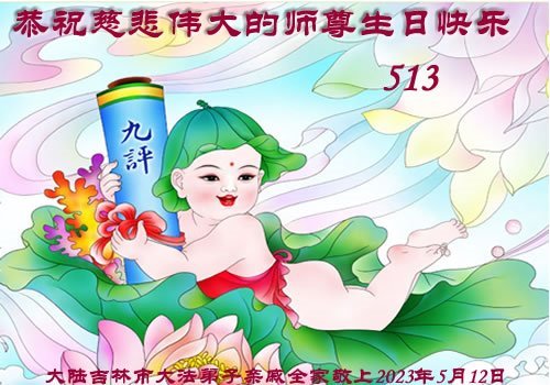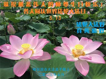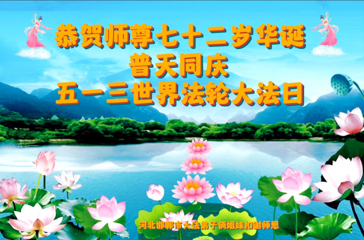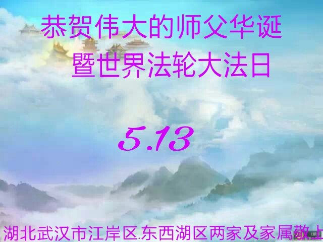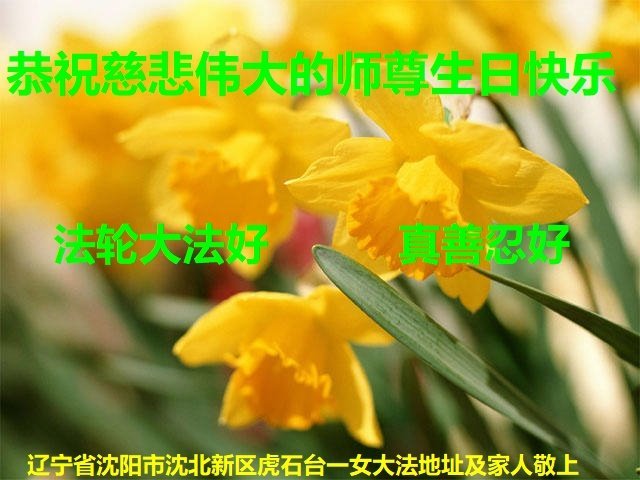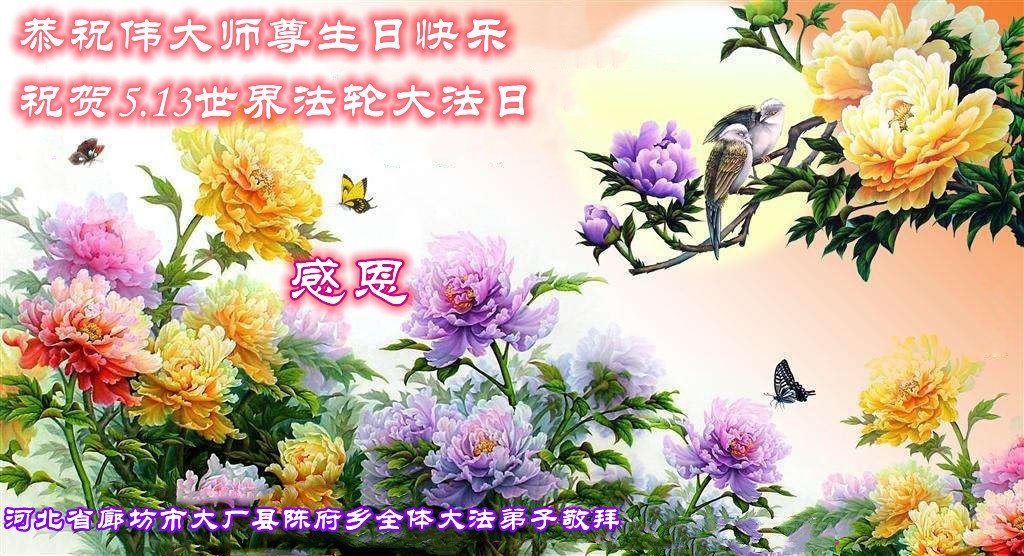 黑龙江省宾县所有明真相众生的肺腑之言与祝愿:五月十三日是普天同庆、隆重而欢庆的节日!不只是大法弟子的节日,也是普天众生的节日!我们怀着无比喜悦的心情,恭祝慈悲伟大的李大师生日快乐!法轮大法日生生不息、万古留传!真诚的问候李大师:您辛苦了!感谢您救度之恩!同时也感激您教的大法弟子!
