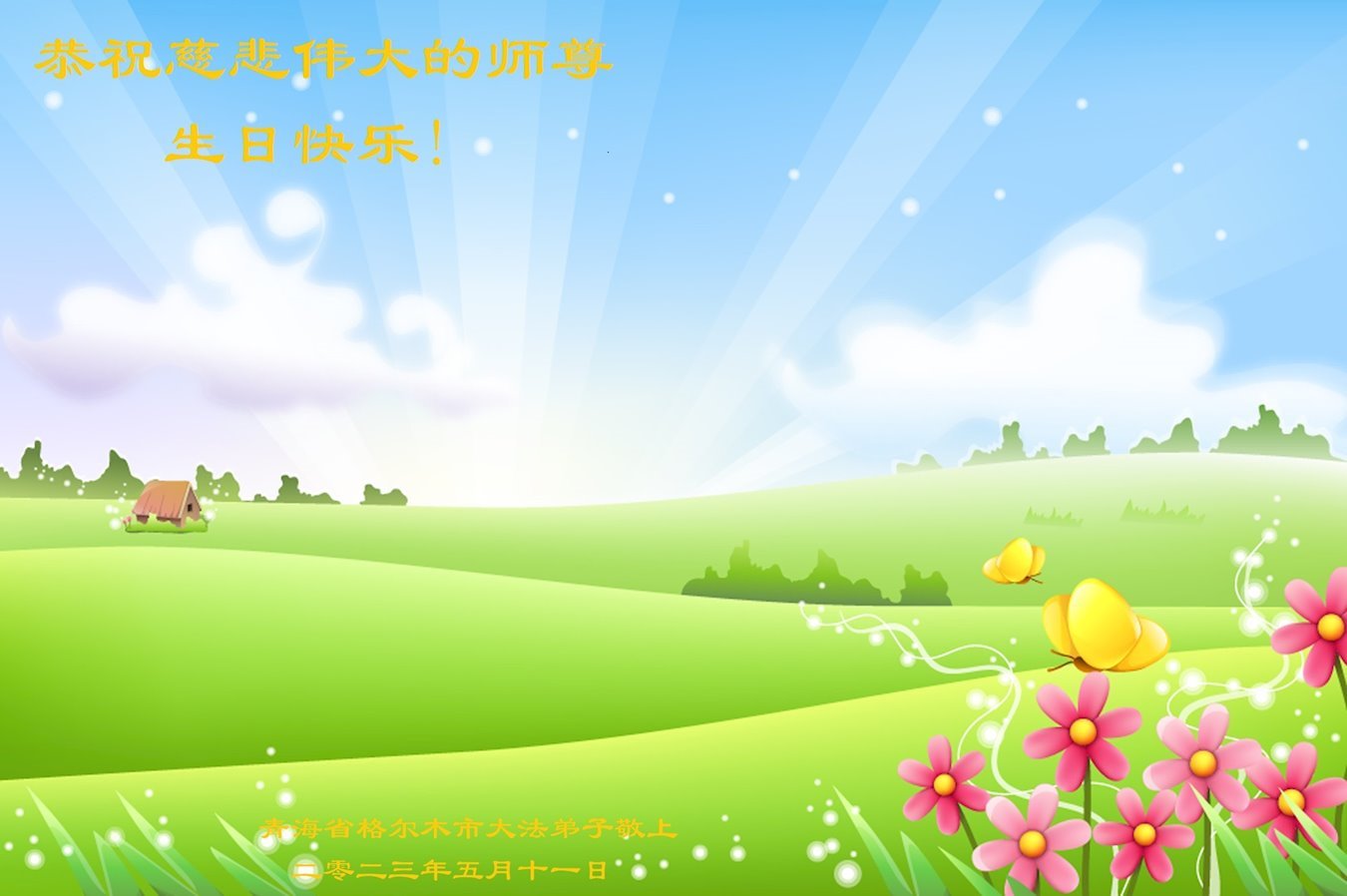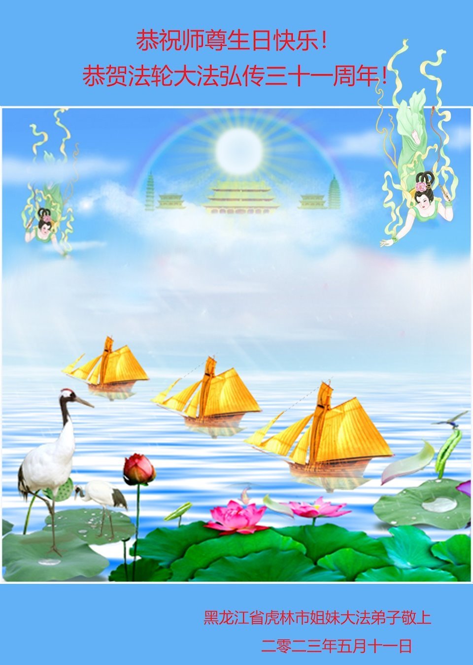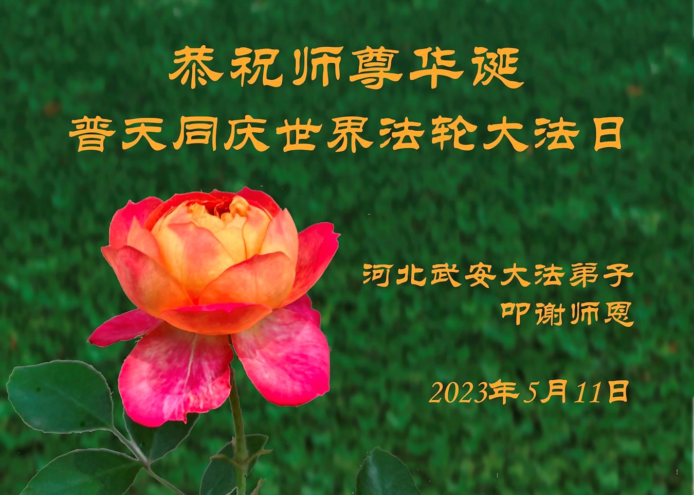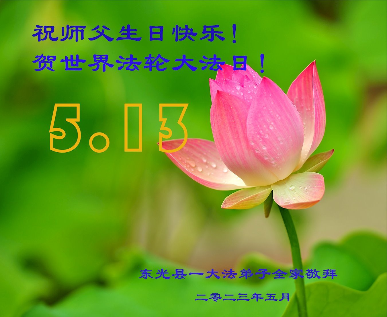 黑龙江省宾县所有明真相众生的肺腑之言与祝愿:五月十三日是普天同庆、隆重而欢庆的节日!不只是大法弟子的节日,也是普天众生的节日!我们怀着无比喜悦的心情,恭祝慈悲伟大的李大师生日快乐!法轮大法日生生不息、万古留传!真诚的问候李大师:您辛苦了!感谢您救度之恩!同时也感激您教的大法弟子!