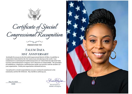 二零二三年五月十四日克利夫兰法轮功学员庆祝世界法轮大法日举行集体炼功弘法活动。国会女议员颁发国会特别褒奖证书。