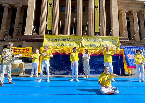 五月十三日,昆士兰法轮功学员齐聚在市中心的乔治国王广场以歌舞、音乐的形式,庆祝世界法轮大法日,表达他们对师尊的无限敬意和感恩。