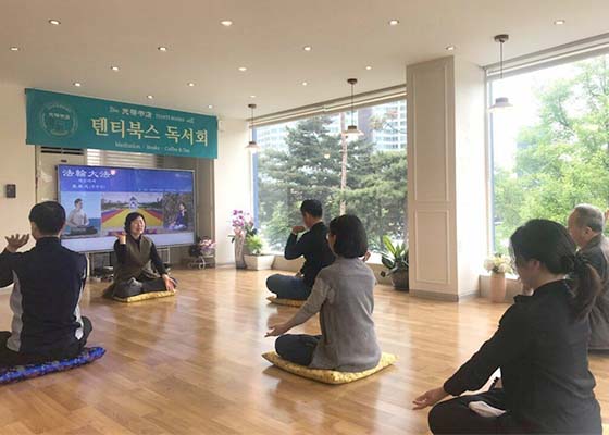位于韩国首尔龙山区的天梯书店为帮助人们修炼法轮大法,每月都会举办一次法轮大法“九天学习班”,面向市民免费教授法轮功的炼功动作和功理。