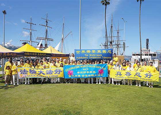 五月七日,美国加州圣地亚哥法轮功学员在圣地亚哥港口县政府大楼前的海滨公园,举行集体炼功、讲真相活动,庆祝世界法轮大法日。