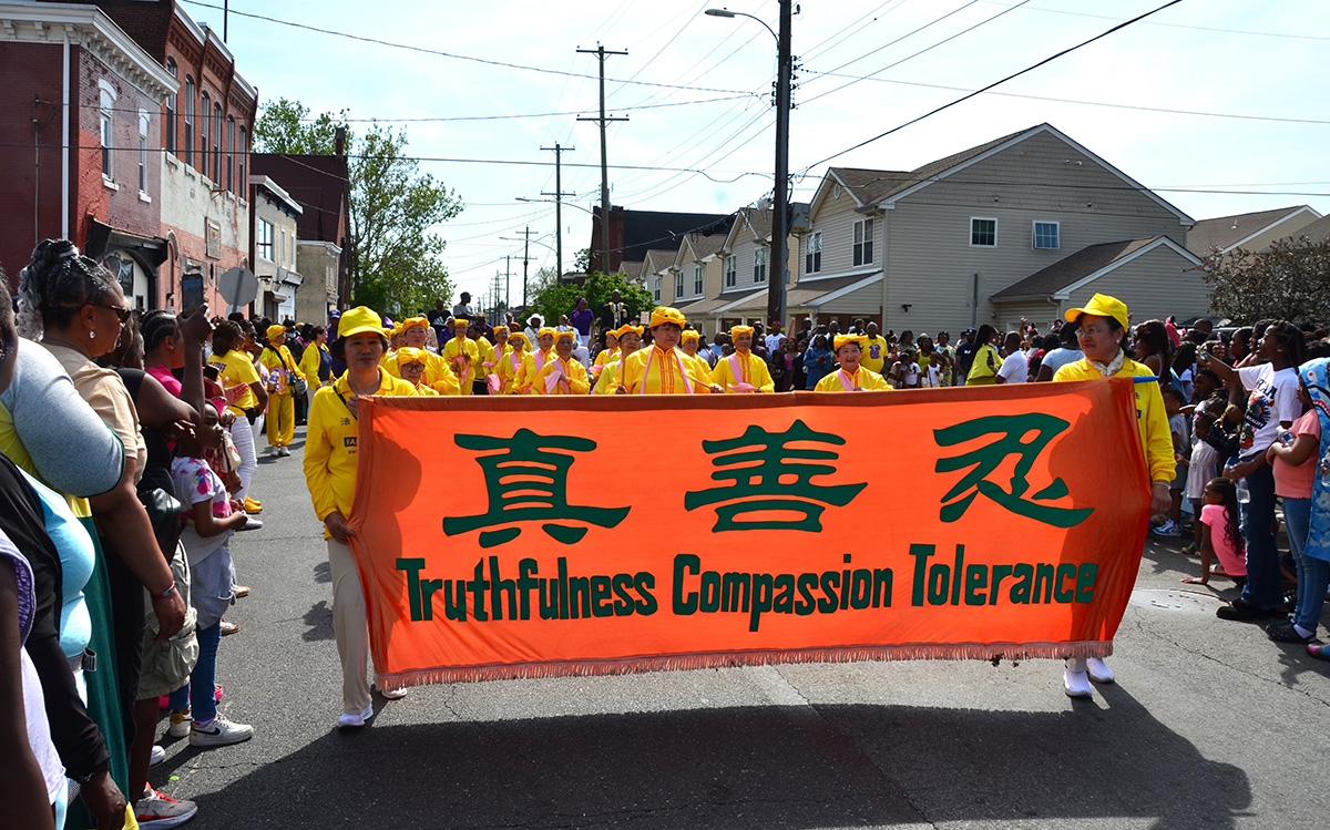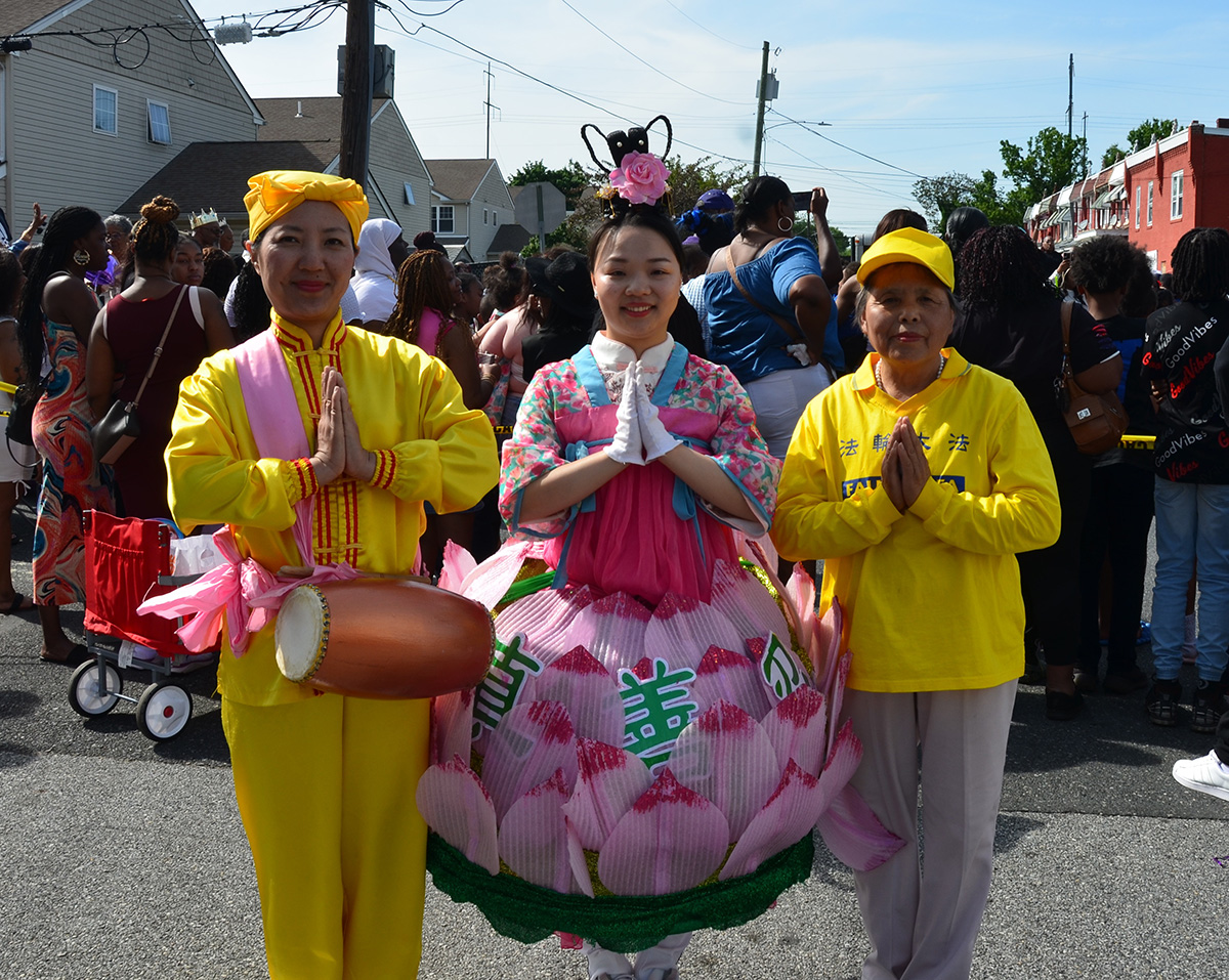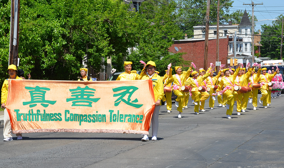 由数十名法轮功学员组成的炼功队、腰鼓队和莲花队是浩浩荡荡游行队伍中唯一的亚裔团体,特别引人注目。她们身穿中国风韵的亮黄色服装,面带喜悦,迈着轻盈整齐的步伐,敲出雄壮的鼓声,赢得沿途民众的阵阵热烈掌声,许多人争相拍照录像。