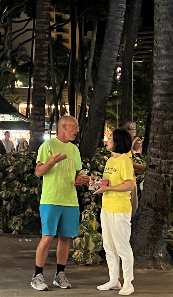 二零二三年五月十三日是世界法轮大法日,夏威夷法轮功学员在火奴鲁鲁游客聚集的威基基(Waikiki)的卡拉卡瓦(Kalakaua)大道展示功法、发放大法真相资料和小莲花、演唱大法弟子创作的歌曲,以各种方式讲大法真相,与来自世界各地的游客分享法轮大法的美好。