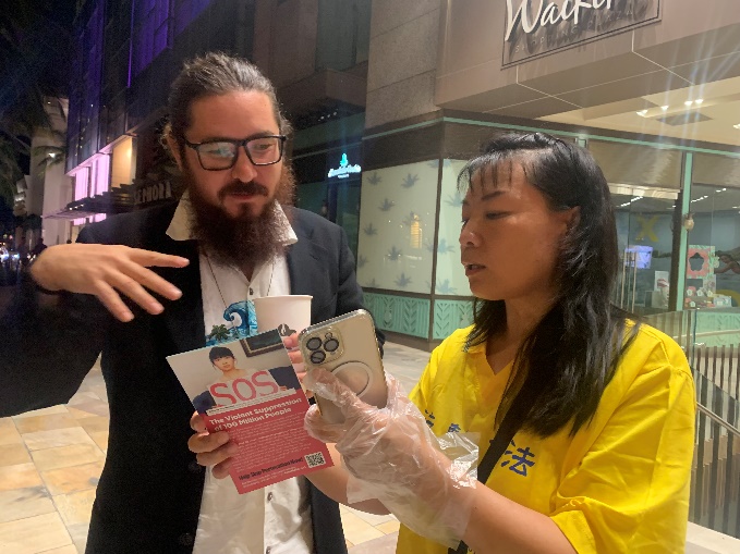 一位来自夏威夷当地的小伙子说中共迫害法轮功是不可接受的。他觉得法轮功真、善、忍的理念很好,对学习法轮功感兴趣,并仔细询问了炼功点的相关情况,希望自己也能早日学会。
