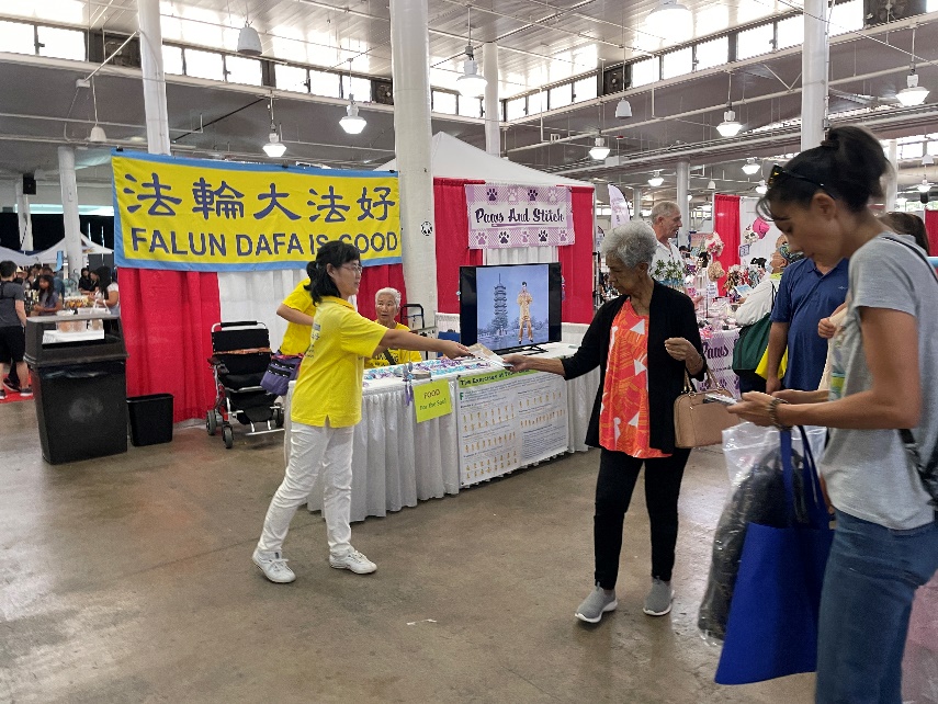 一位来自洛杉矶的西人女士主动来到展位前,表达对法轮功学员的尊敬和关爱,她握着法轮功学员的手连声说“对不起,对不起,我很抱歉,中共这样迫害你们。”
