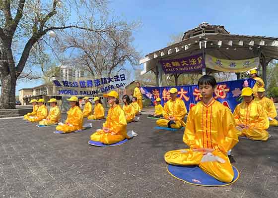 五月十三日这一天阳光明媚,春意盎然,加拿大埃德蒙顿法轮大法学员以集体炼功、打腰鼓和讲真相的方式欢庆法轮大法日,恭祝师尊生日快乐。