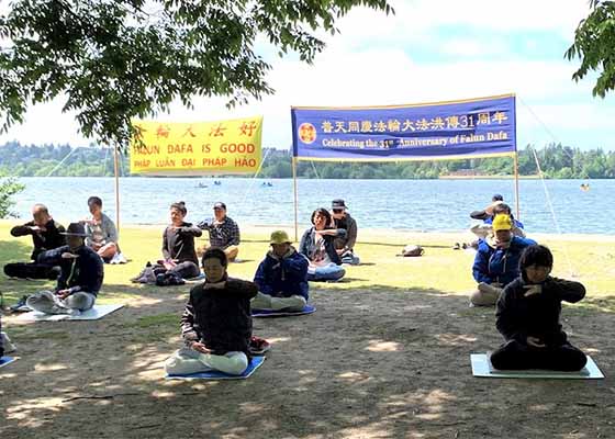 五月二十七日,美国西雅图法轮功学员在绿湖公园集体炼功,并向感兴趣的游人派发大法资料,介绍法轮功并揭露中共对法轮功的残酷迫害。