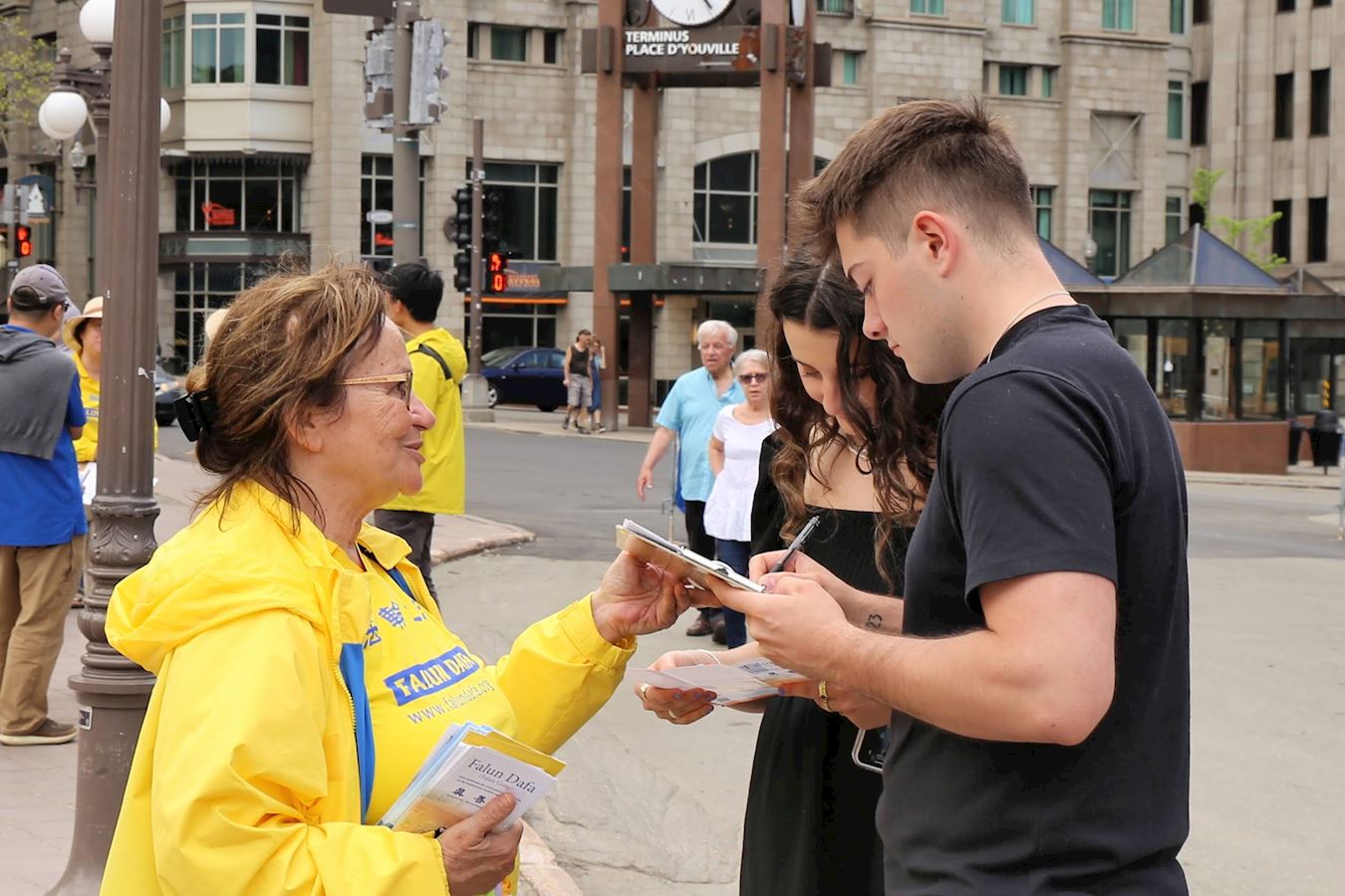 魁北克政府公务员齐雅纳(Kiana)在得知中共迫害法轮功、活摘法轮功学员器官的罪行后,十分震惊,她对法轮功学员说:“这太可怕了,每个人都应该知道这件事,国际社会应该施压,阻止(中共)活摘器官。你们加油啊!”