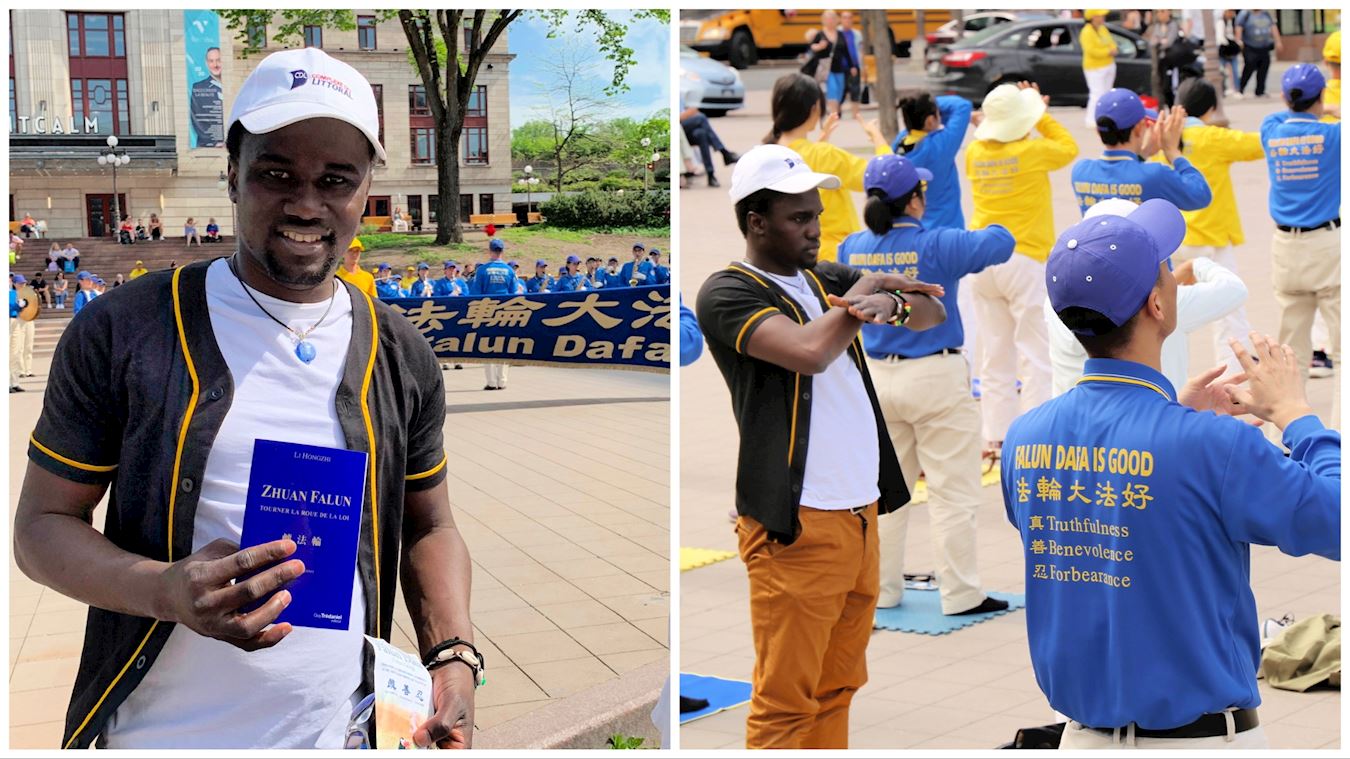 大学生亚库巴(Yacouba)在听了关于法轮大法的介绍后,一下被吸引住,立即跟着法轮功学员炼完了五套功法,并且在现场购买了一本法语版的《转法轮》。