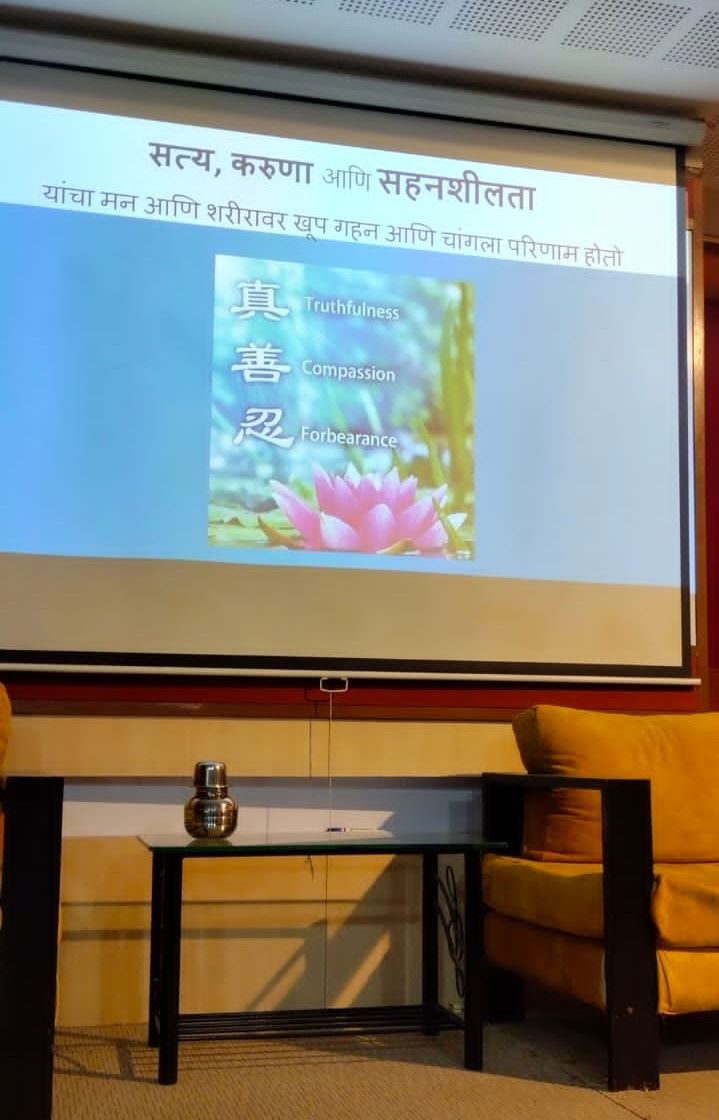 一名当地学员在学校礼堂举办了一个半小时的弘法活动,他们演示法轮大法的全部五套功法。其中一位学员阿南德·波菲尔(Anand Pophale)是来自浦那(Pune)的IT专业人士。他用幻灯放映(PPT)演示文稿,详细介绍了法轮大法修炼功法及其核心原则真、善、忍,并讲述了中共是如何迫害这一精神信仰的。