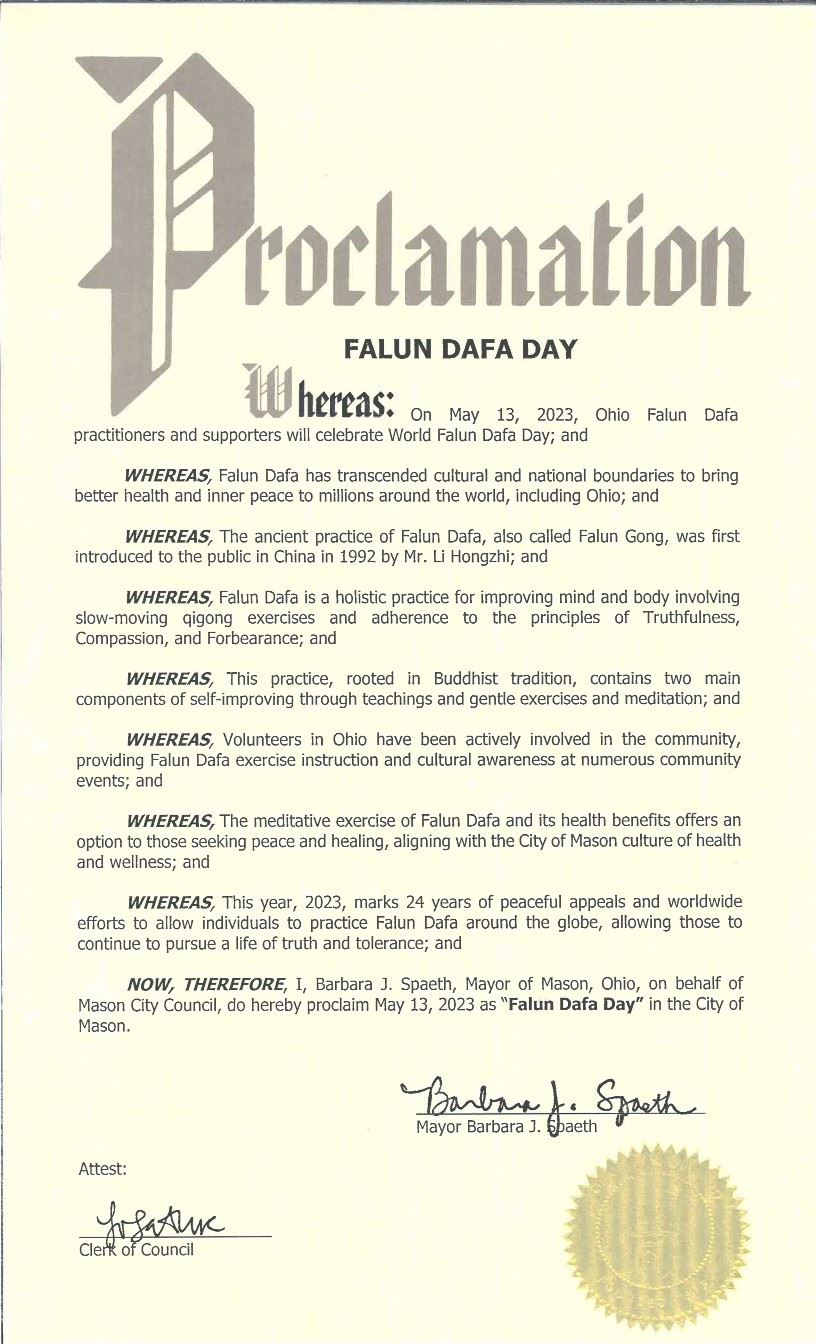 因此,我,俄亥俄州梅森市市长,芭芭拉·J·斯贝斯,谨代表梅森市议会,在此宣布二零二三年五月十三日为梅森市的“法轮大法日”。