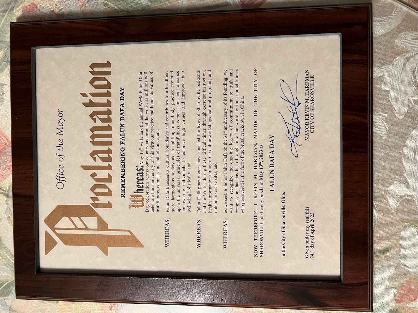 因此,现在,我,凯文·M·哈德曼,莎朗维尔市市长,特此宣布 二零二三年五月十三日为莎朗维尔市“法轮大法日”。