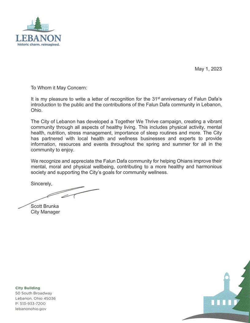 我很荣幸能够书写这封认可信,为纪念法轮大法弘传世界三十一周年和对俄亥俄州黎巴嫩市的贡献。