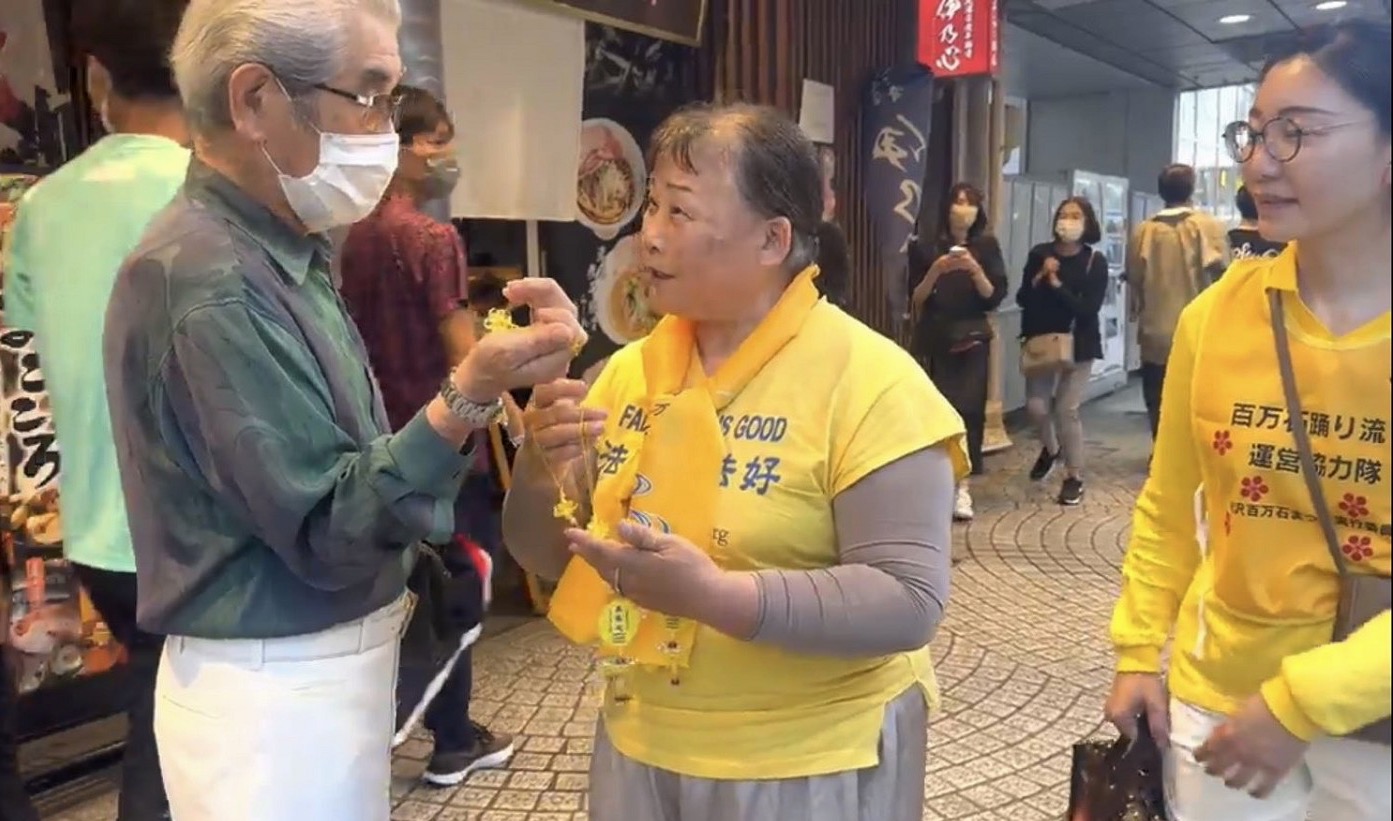 ![]() 图2:法轮功学员向日本老人发放小莲花,并向观众讲述法轮大法弘传世界多个国家的美好。 |