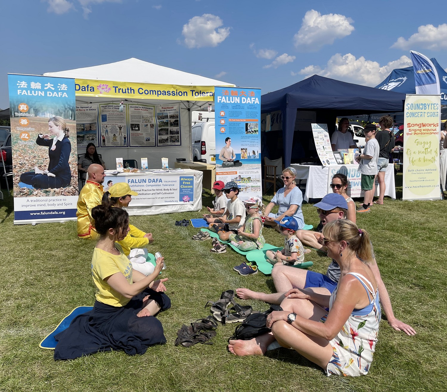 【明慧网二零二三年六月二十五日】二零二三年六月十日星期六,英国法轮功学员参加了在伦敦以南的阿什提亚德地区(Ashtead)举办的盛夏“乡村日”活动,并且设立展位。学员们向参观者展示五套功法和传播大法的美好,很多当地人和孩子们由此喜欢上了法轮功,许多人现场学功。