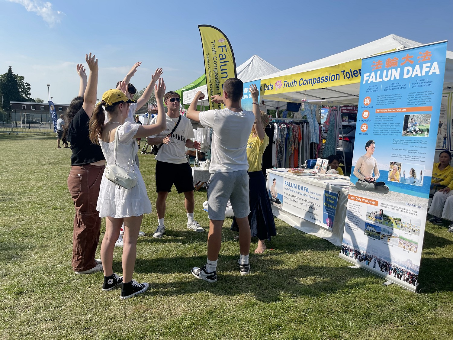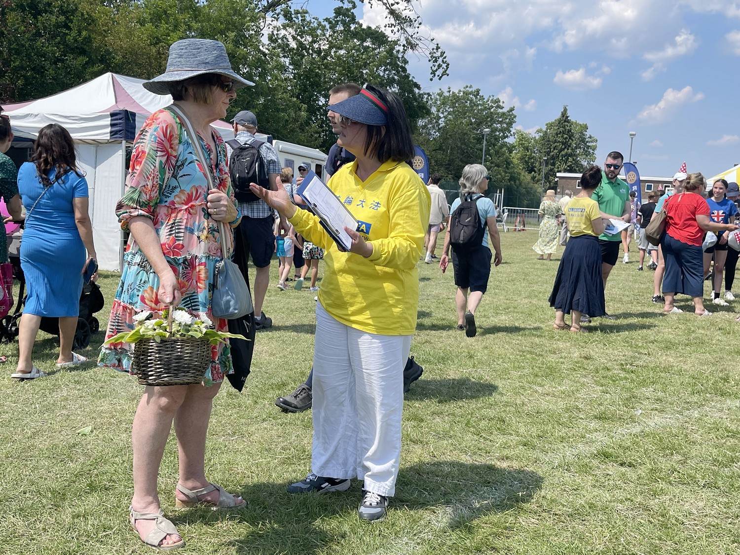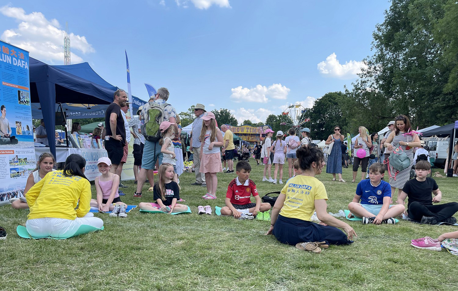 英国的夏天艳阳高照,清风徐徐,从官方到民间团体的嘉年华活动都在开展着。当地法轮功学员已经在这里弘法十年了。活动主办方为当地小区和周边地区的所有人提供一整天的娱乐活动,如野外竞技、现场音乐表演、游乐场、狗展、老式车辆展示等,还包括一百多个摊位。