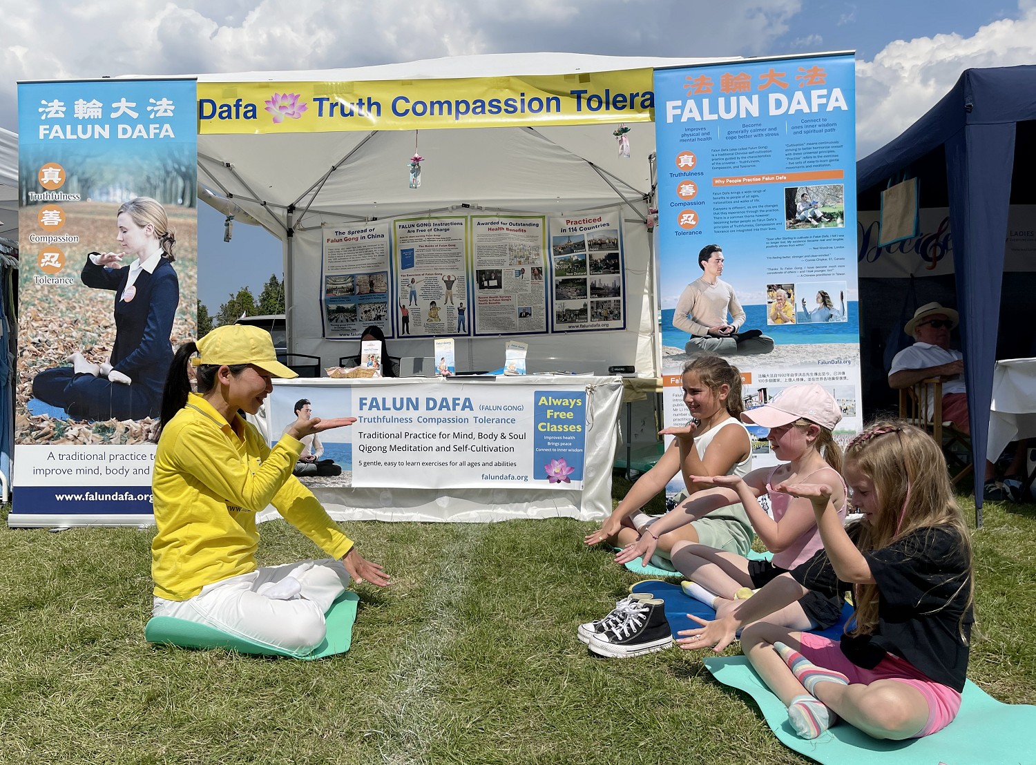 两个妈妈分别带着她们的上四年级的女儿们要体验法轮功。随着炼功音乐坐在草地上的小朋友们跟着法轮功学员学炼打坐,他们其中多数都能两腿双盘。站在一旁的妈妈吕贝卡(Rebecca)说:“我都能感受到能量,这个功法太好了!”她的小孩在学校学习瑜伽,但她希望学员能去学校里教功法。妈妈们表示会向校方建议开设法轮功炼功班。