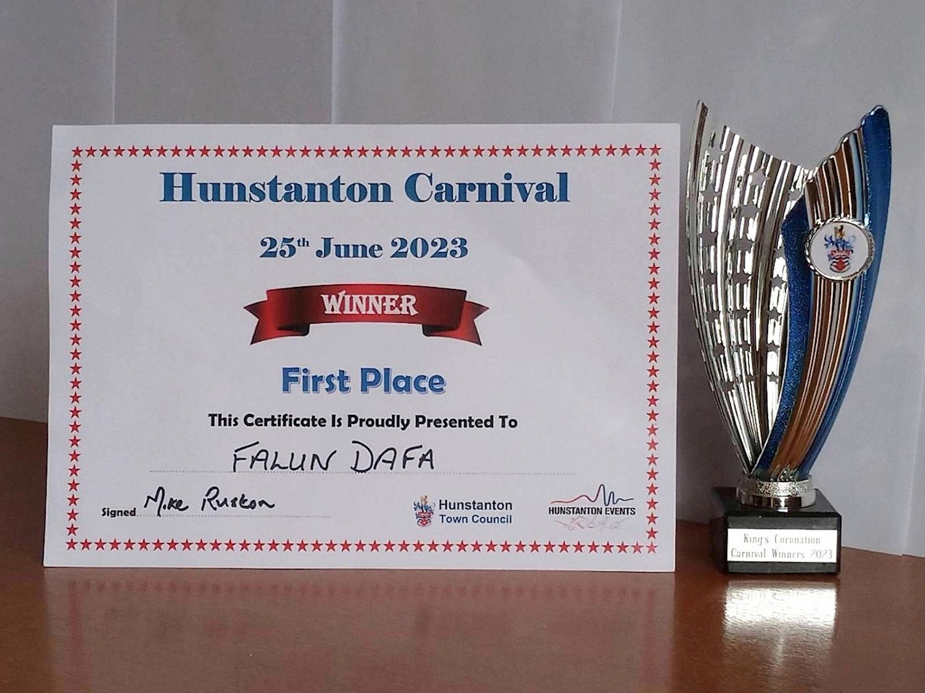 【明慧网二零二三年六月二十九日】二零二三年六月二十五日,部分英国法轮功学员参加了诺福克郡(Norfolk)亨斯坦顿(Hunstanton)举办的主题为“国王加冕”(The King’s Coronation)嘉年华周末庆典活动。游行结束后,主办方亨斯坦顿市议会的议会首席兼市长迈克·拉斯顿(Mike Ruston)为法轮功颁发庆典活动一等奖。