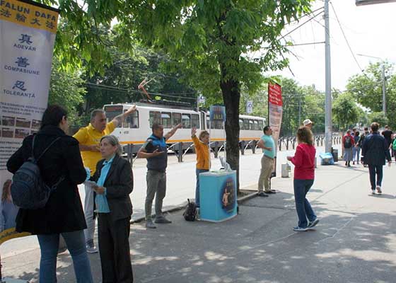 五月二十日,来自罗马尼亚首都布加勒斯特的部份法轮功学员在AFI科特罗切尼购物中心附近向人们介绍法轮大法,以及中共对法轮的迫害。