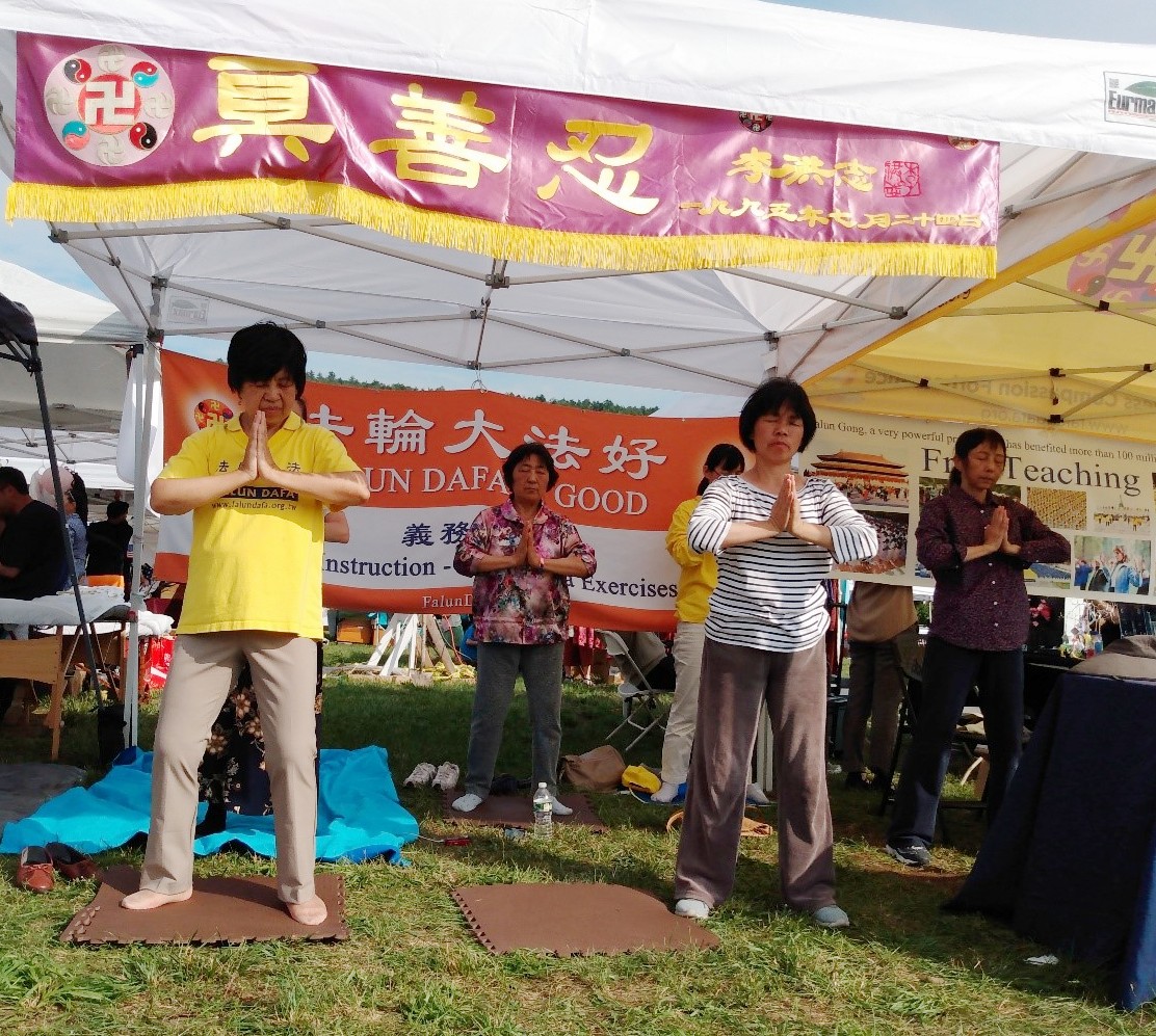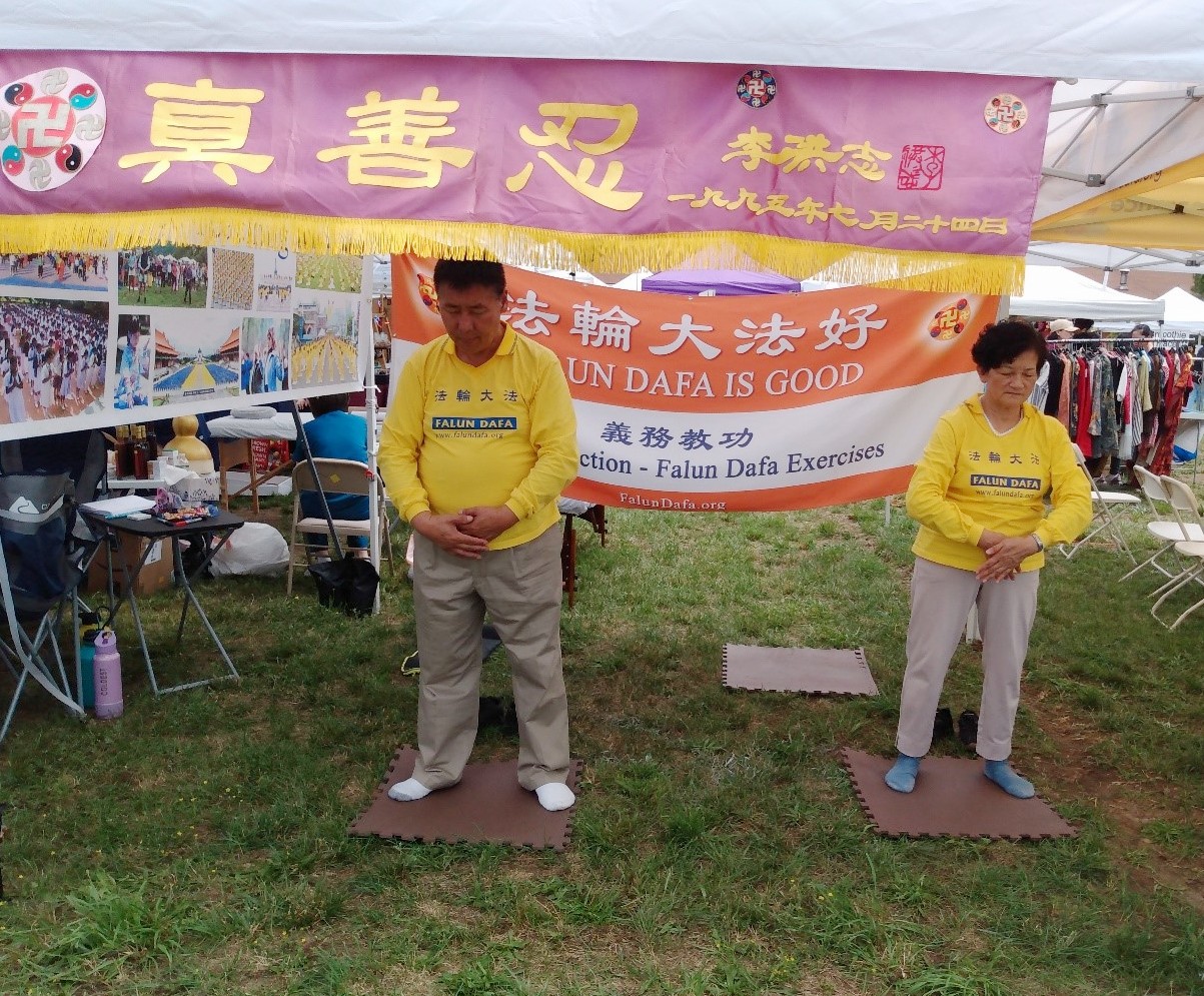 法轮功学员在平静祥和的炼功音乐声中展示五套功法,许多前来参加活动的人们经过展位时都会驻足观看,接过学员递来的法轮功真相传单。聆听学员对法轮功的介绍,以及中共对法轮功长达二十四年的残酷迫害的讯息。