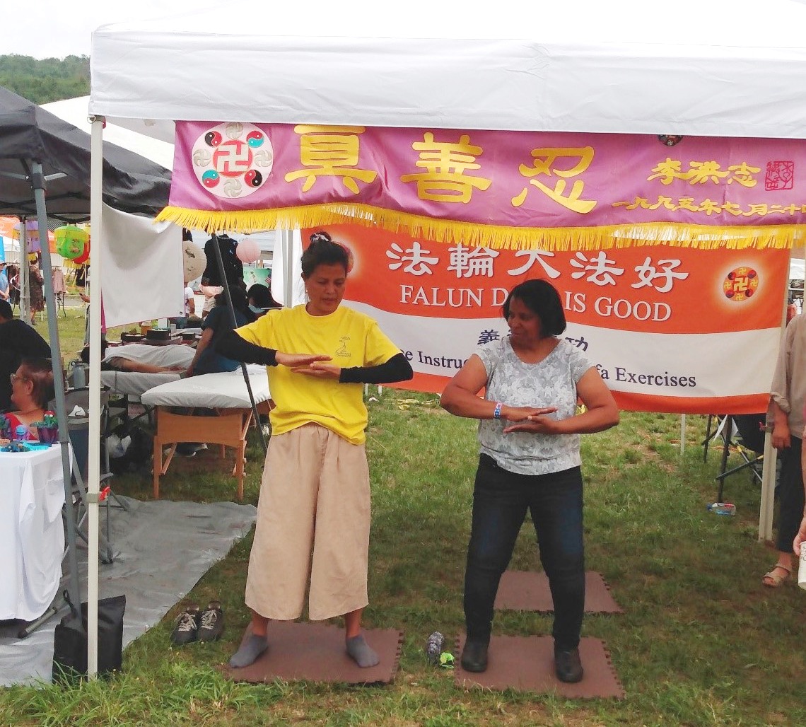 琳恩(Lynn)在听闻了法轮功不仅能带给人健康的身体,还能让人的心灵变的更加充实和祥和,于是在展位上跟学员学炼起了功法。