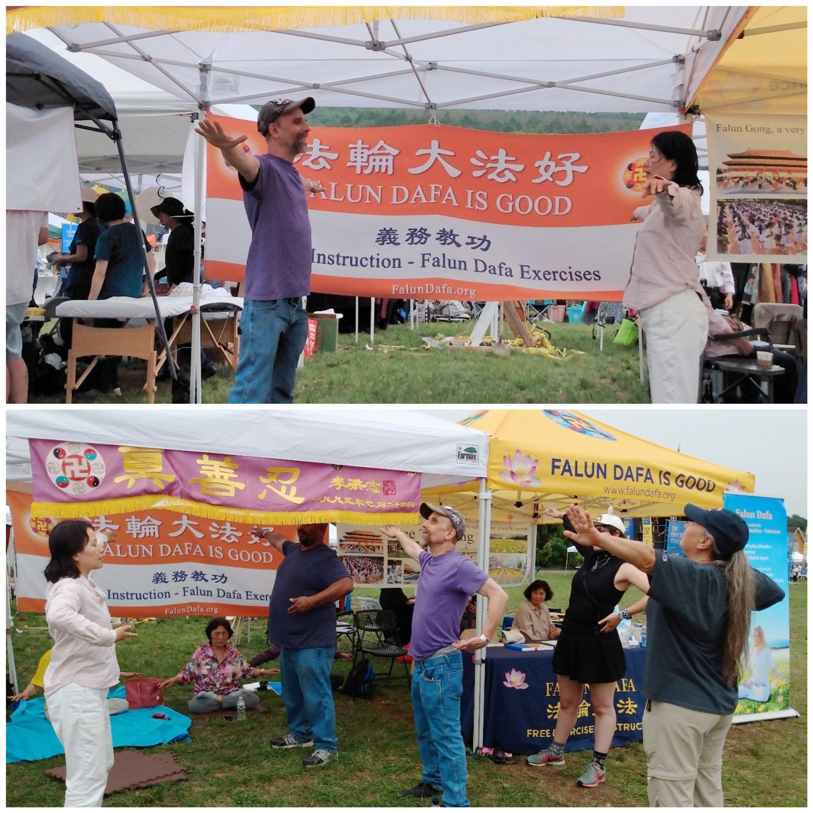 ![]() 图1~2:二零二三年七月一日和七月二日两天,法轮功学员在展位上炼功弘法。 |