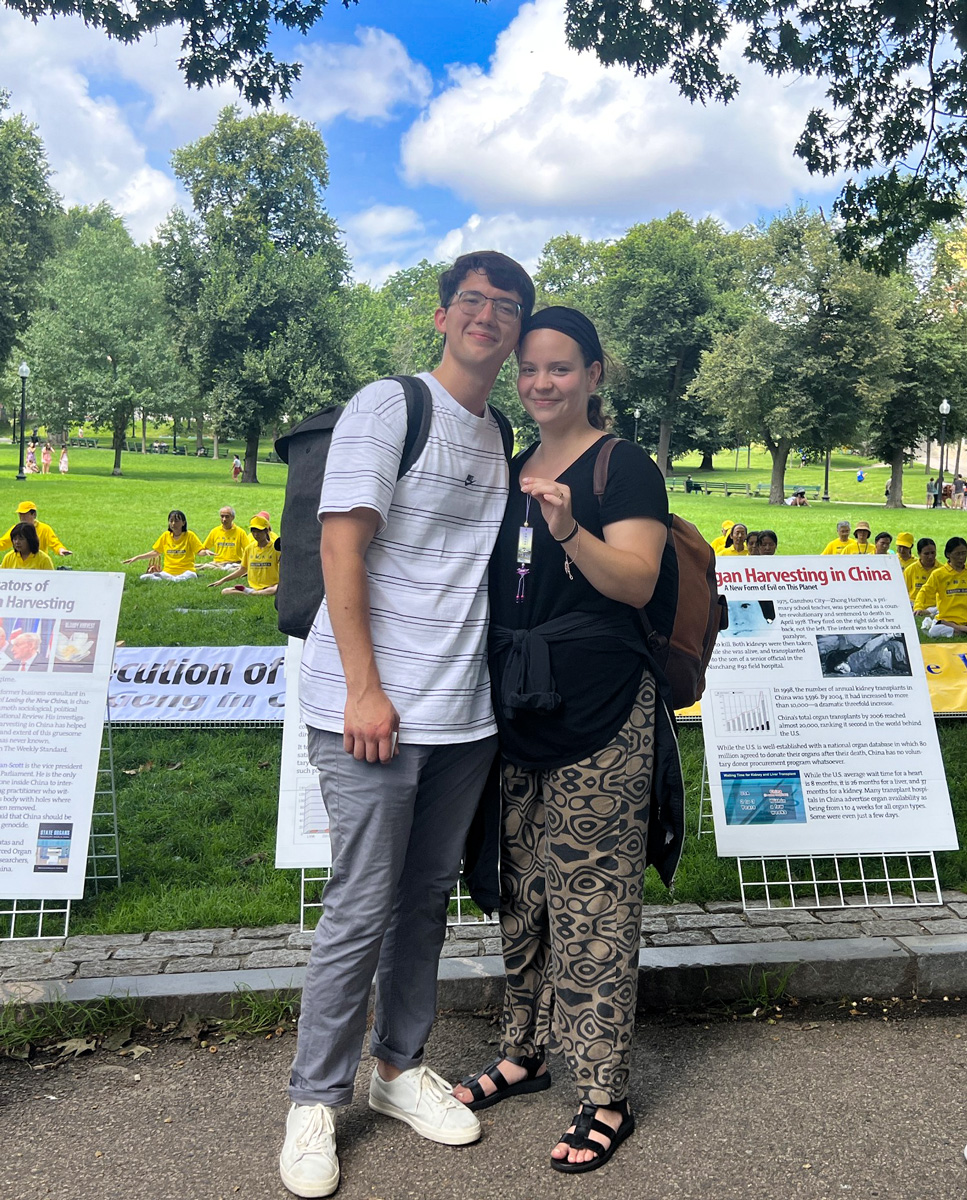 圣荷西居民布列塔尼·莫斯(Brittany Moss)和先生科迪(Cody Moss)来旧金山避暑。当布列塔尼听到法轮功学员在中国受迫害长达二十四年,忍不住的眼睛泛红。她流着泪说,“不好意思,当我听到这个消息,令我感到非常的悲伤难过,我的眼泪实在忍不住的流下来,我真的太难过了。特别是活摘(法轮功学员)器官非法贩卖,太可怕了,我可以为你们做什么?”