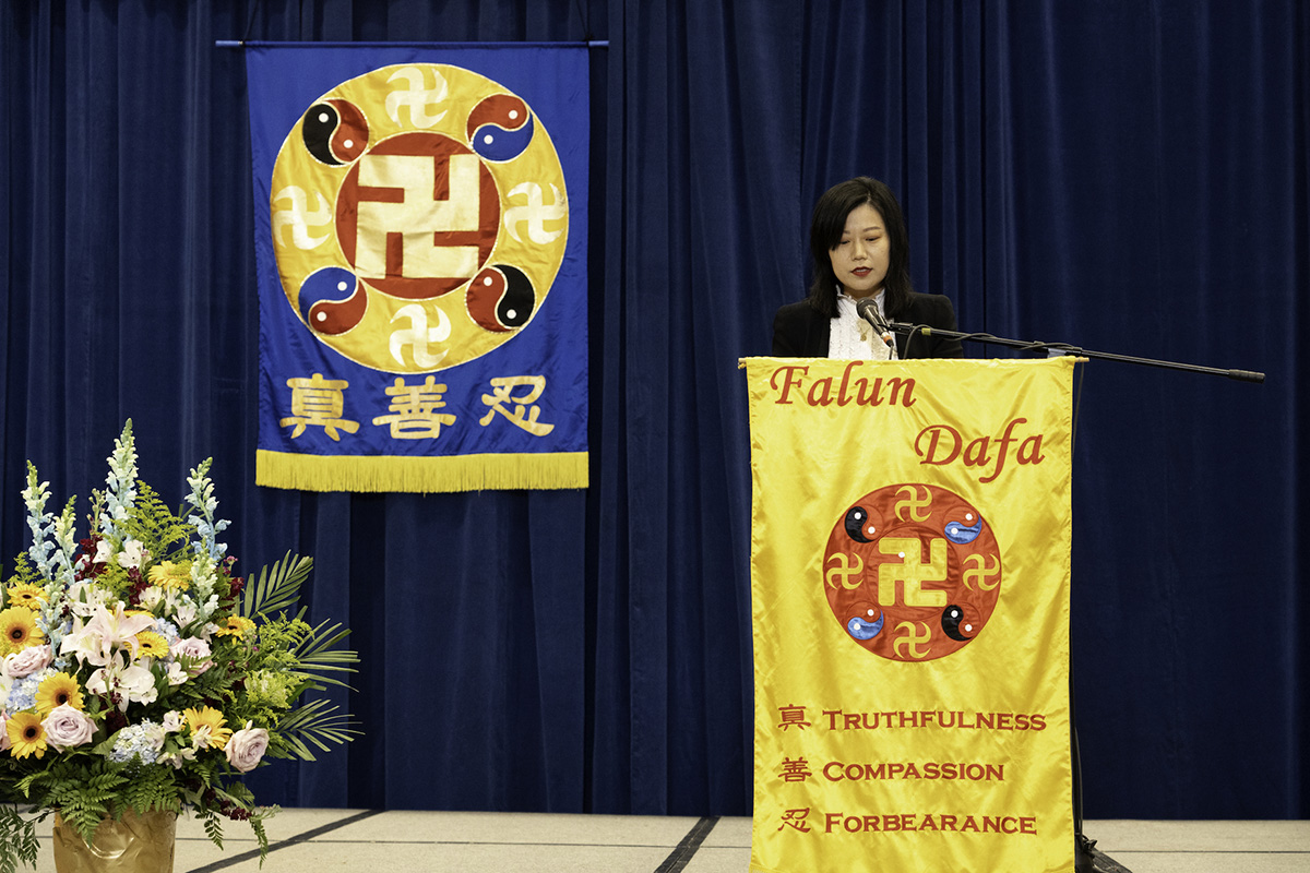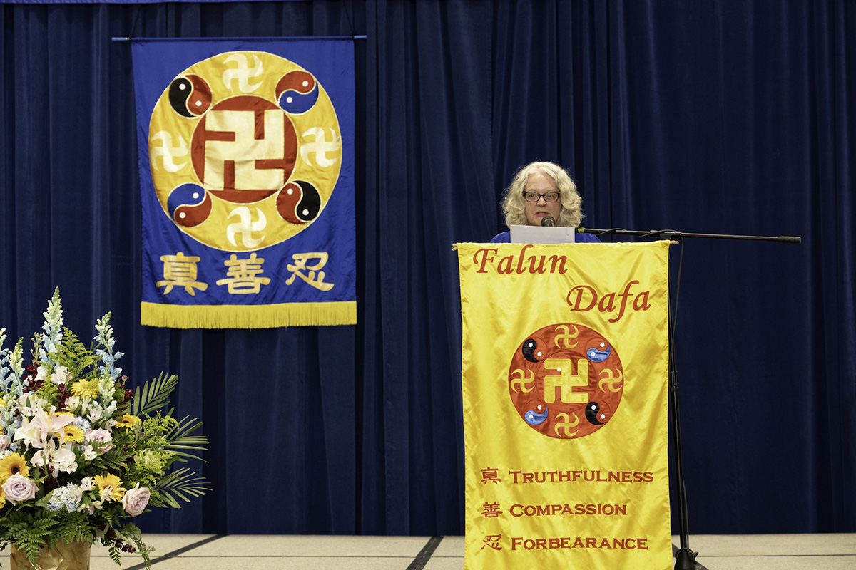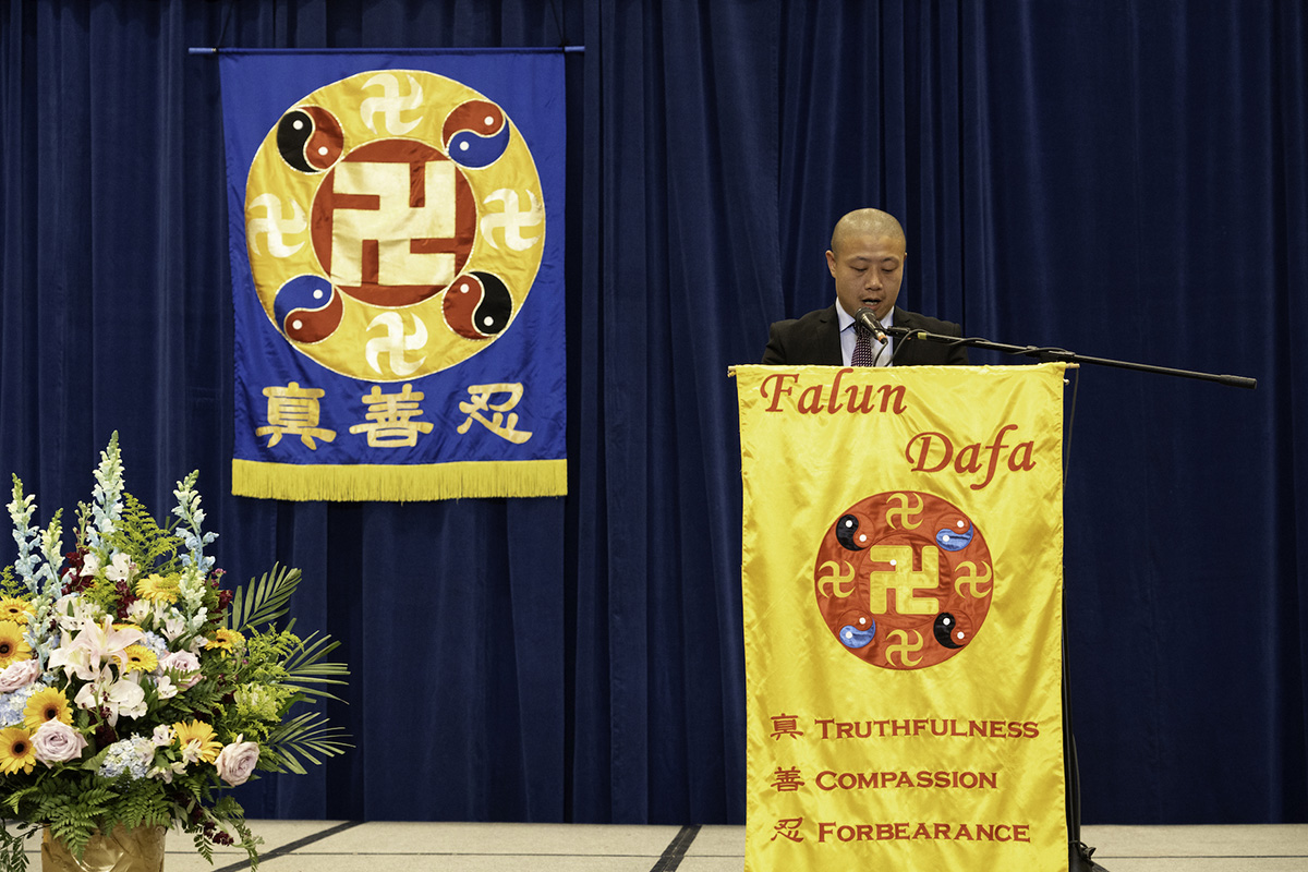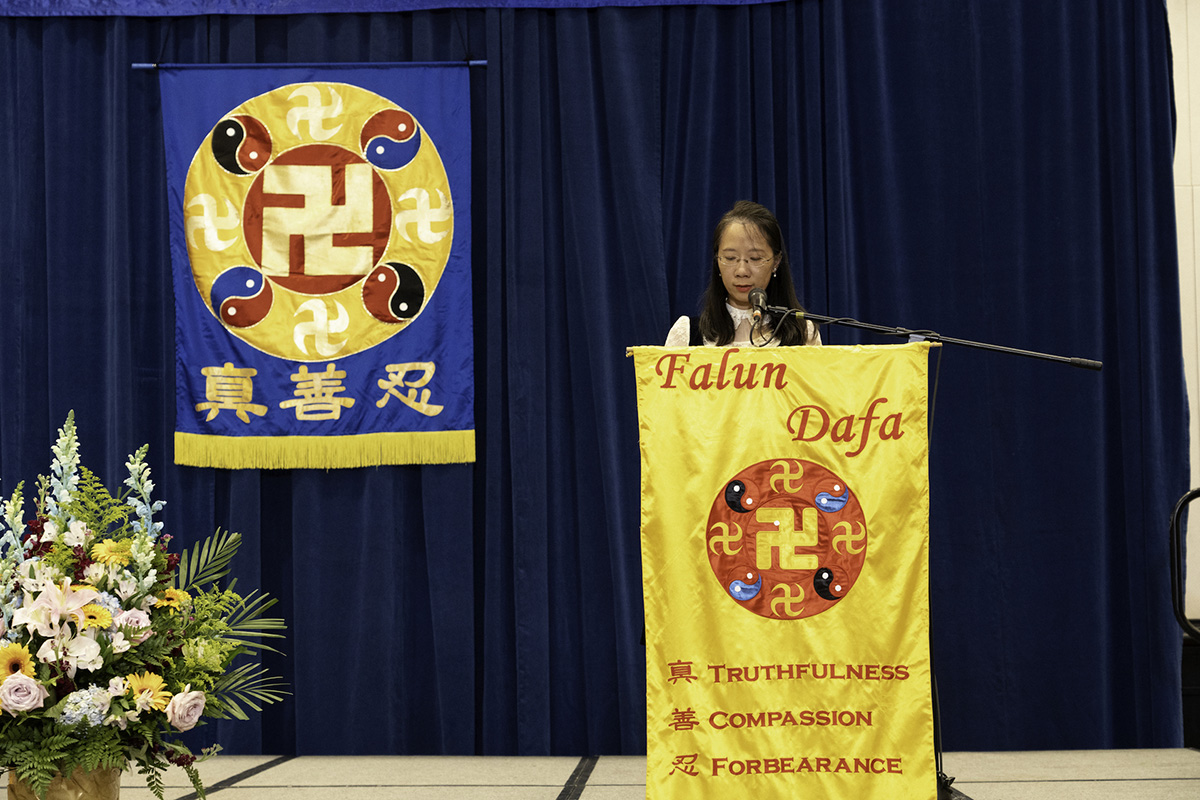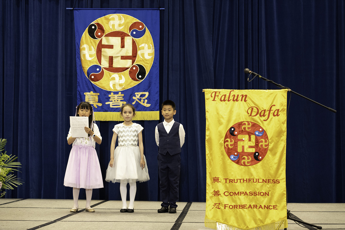 主持人在宣读开幕致辞中说:“大法修炼者在大法中实修,改变的是观念,消去的是业力,升华的是境界,洗净的是自己。”“师尊为弟子们明示了万古的圣缘,大法弟子放弃了过去的圣殿天堂,冒着天胆下世,只为神圣的誓约成为通天的阶梯。”