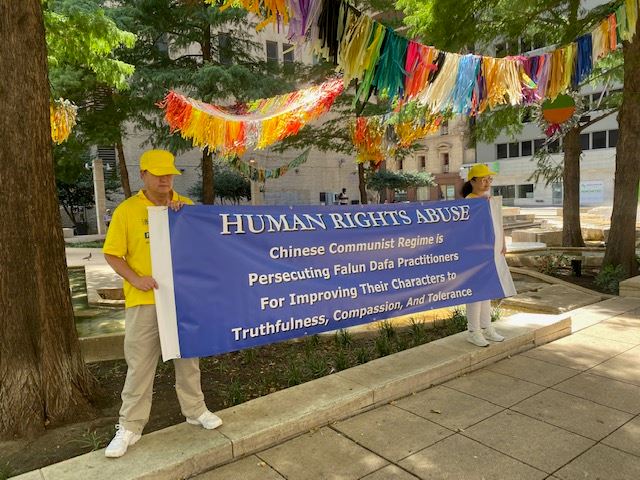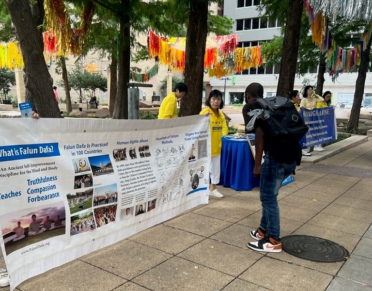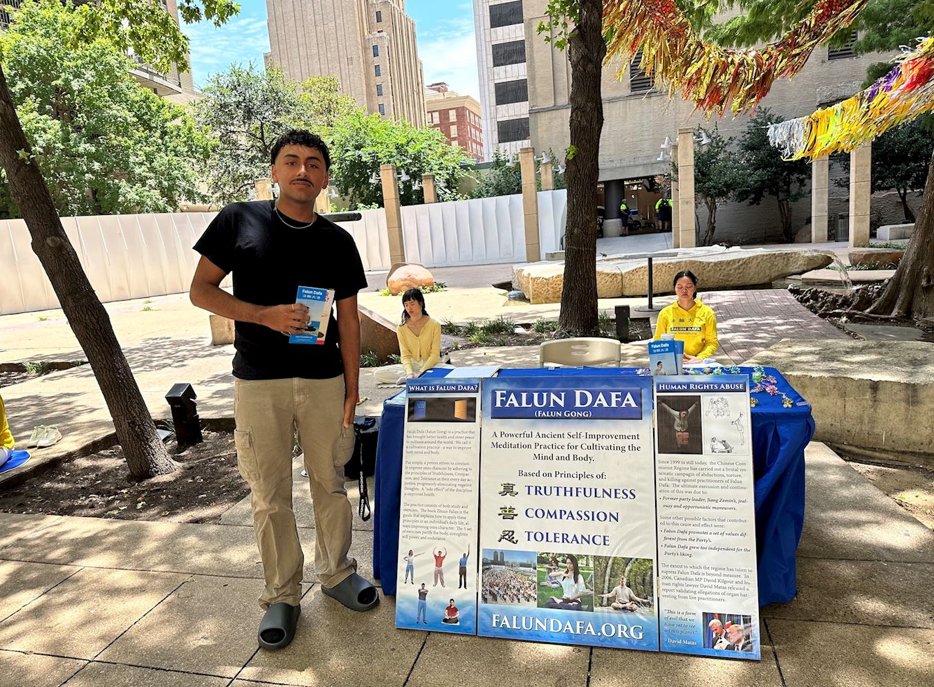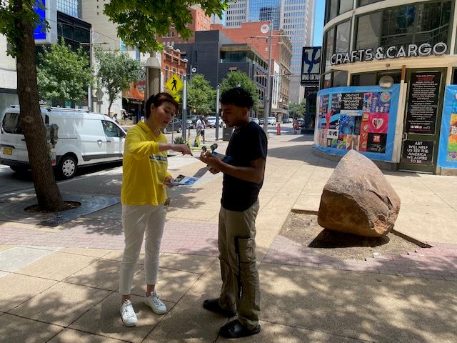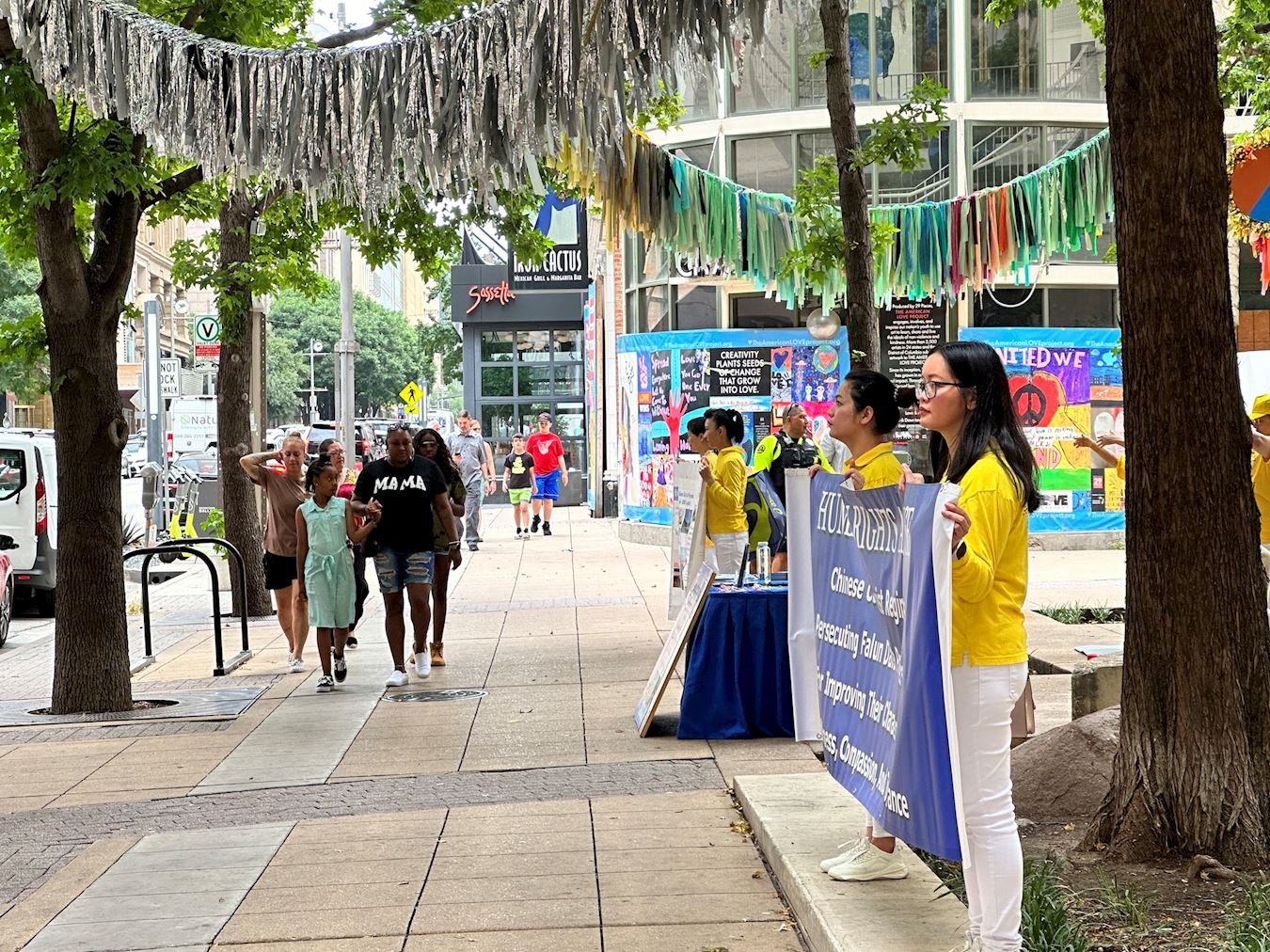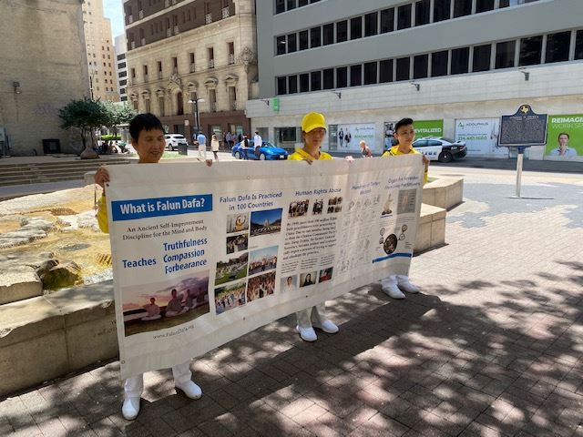 七月是达拉斯最热的季节,气温已连续多日超过华氏一百度。法轮功学员有的在十字路口派发传单、征签,有的沿街打着要求停止迫害和曝光中共迫害手段的横幅,也有的学员演示法轮功五套功法,场面祥和、庄重,引人关注。