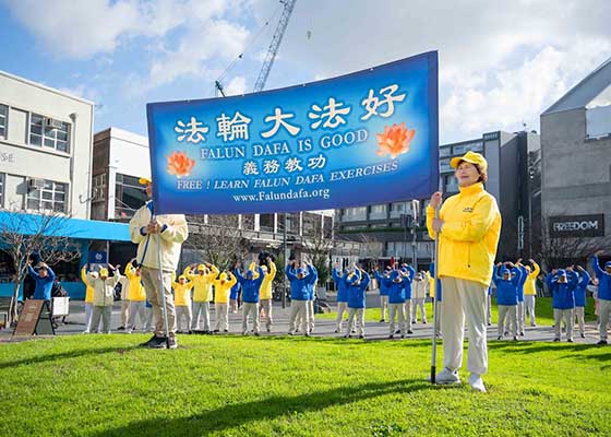 七月十五日,新西兰法轮功学员在奥克兰新市场商业中心炼功、集会,纪念反迫害二十四周年。