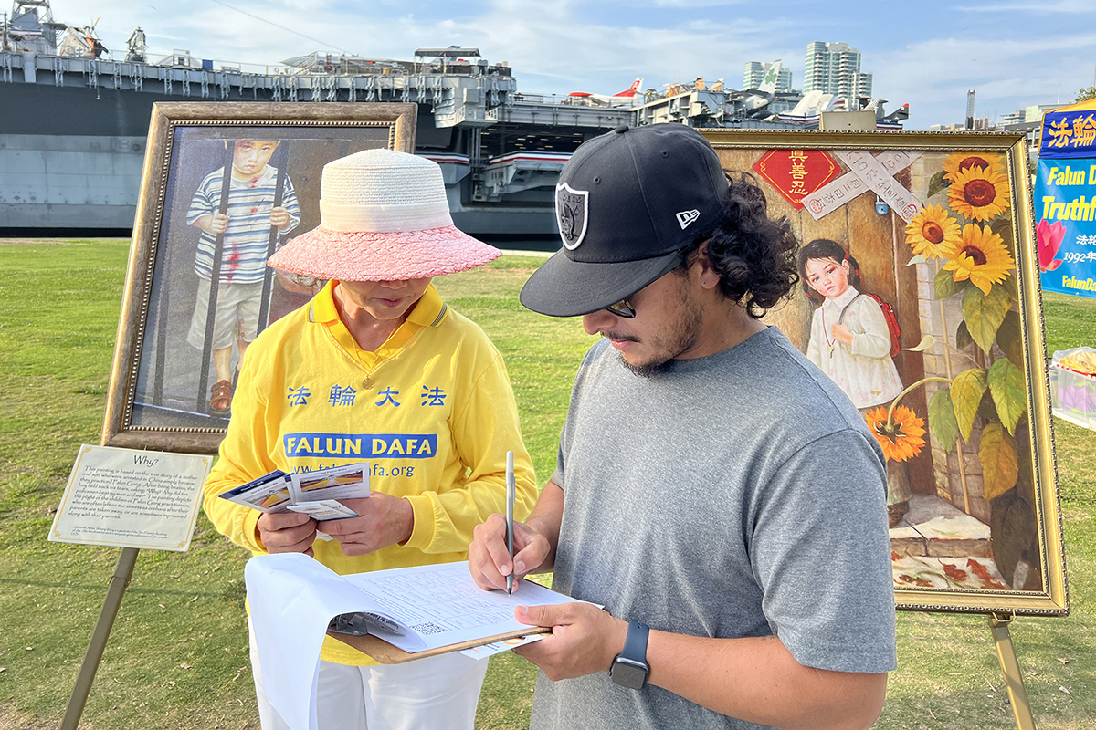 来自加州中部地区的年轻人安德鲁·阿亚拉(Andrew Ayala)看了法轮功学员的功法演示后说:“非常独特,也非常美。”他和同伴都签名支持法轮功学员反迫害。“因为我了解了在那里发生的对法轮功的迫害,很多悲剧,我希望能做点什么,我希望我的签名能帮助拯救生命。”他说。