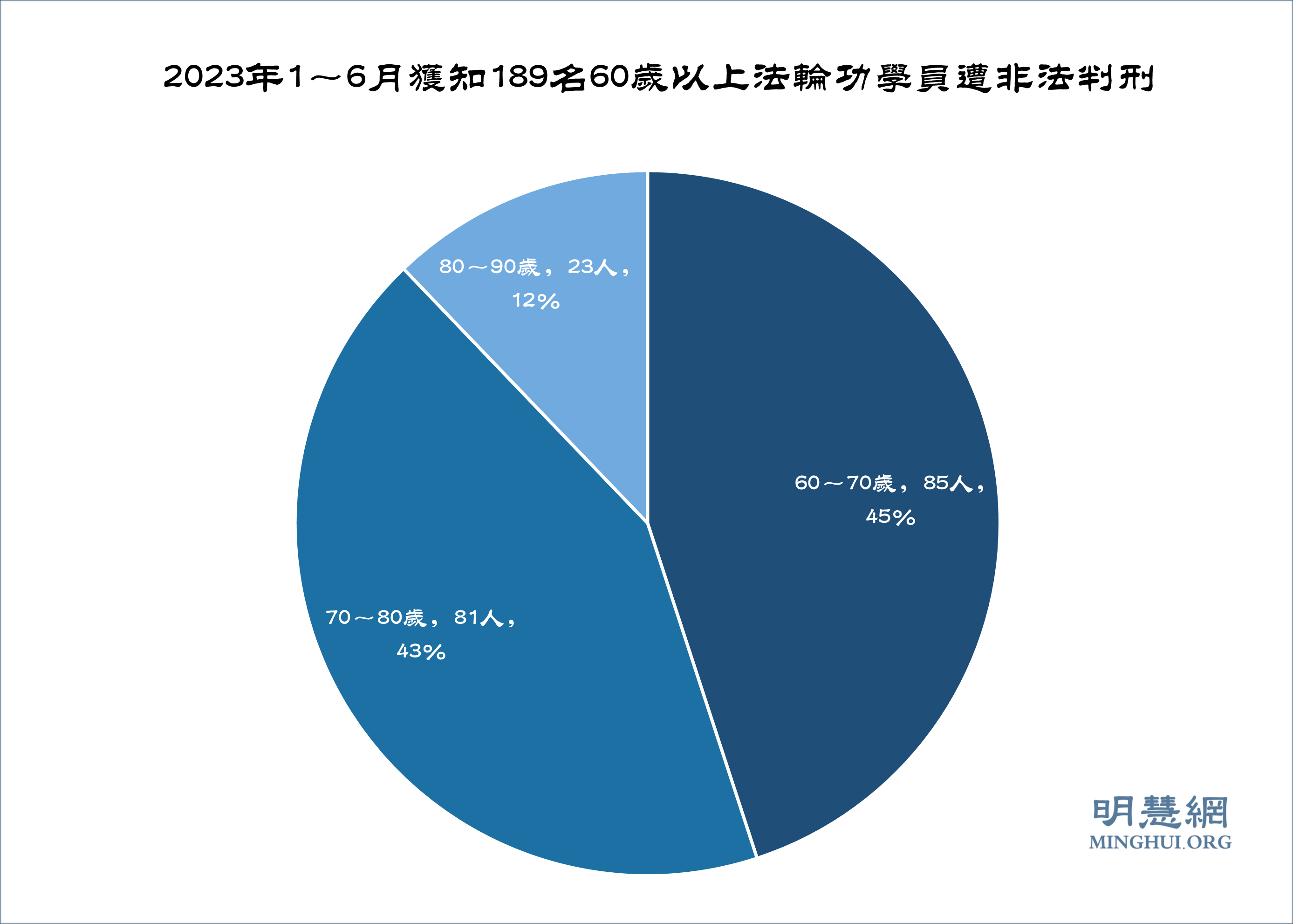 据明慧网报道统计,二零二三年上半年有189名60岁以上老年法轮功学员被非法判刑。其中,80~90岁23人,70~80岁81人,60~70岁85人。年龄最长者88岁。
