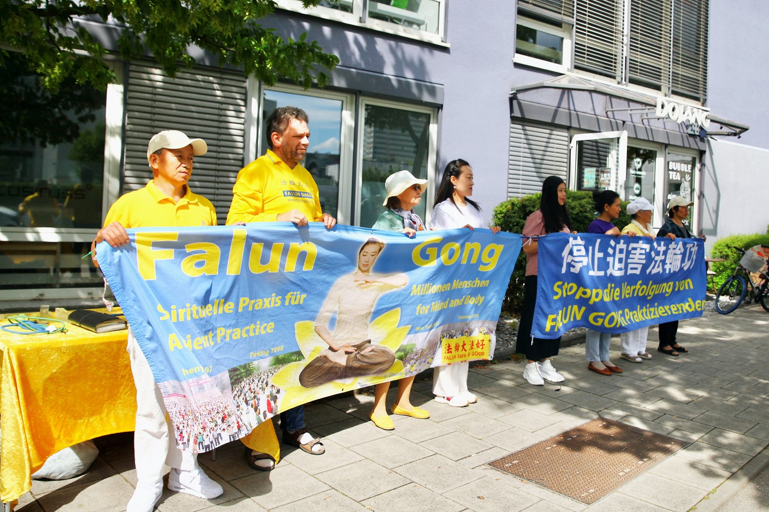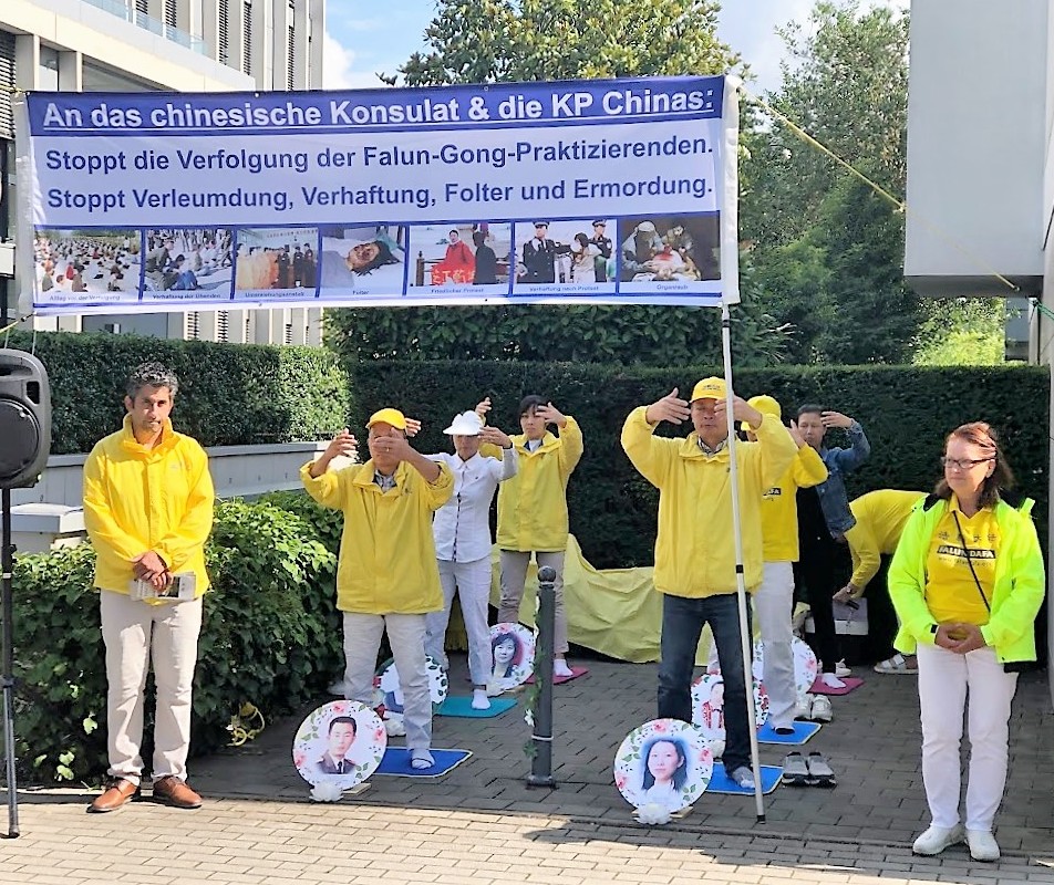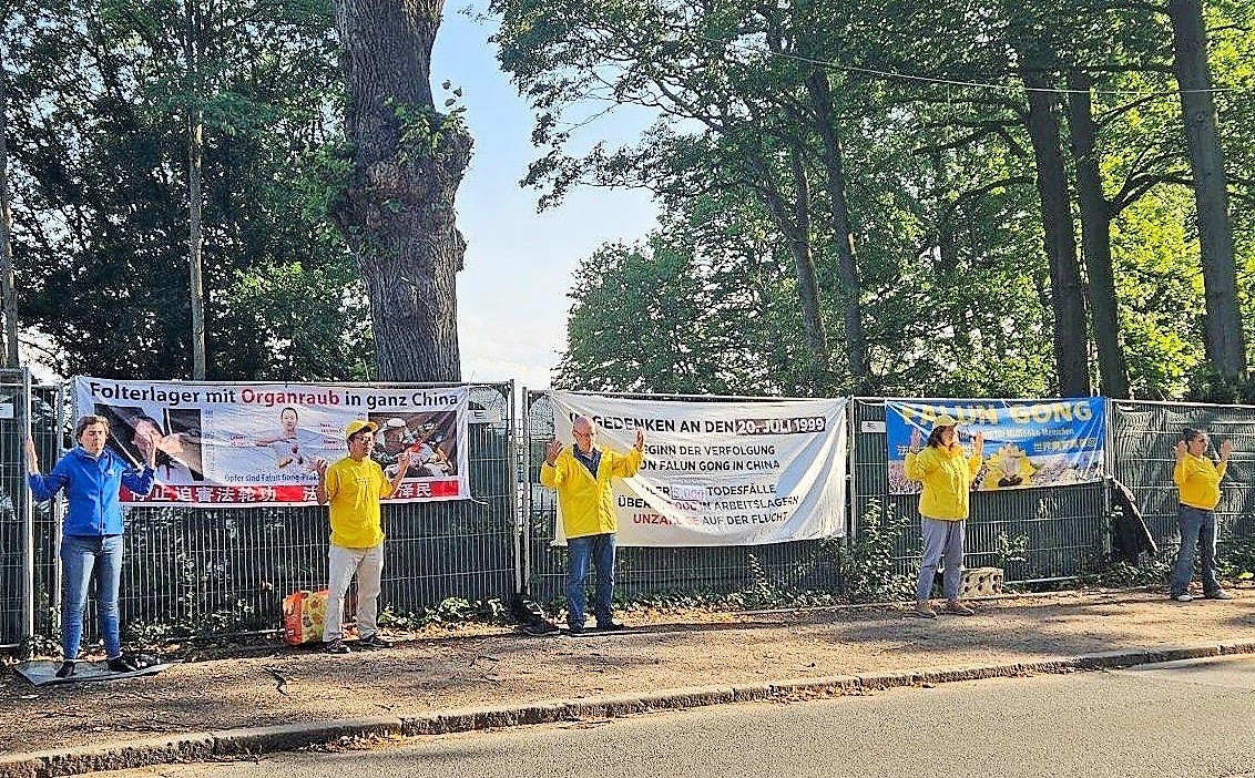 在杜塞尔多夫和慕尼黑的中共领馆前,法轮功学员通过扬声器宣读了一封劝善信,并把这封信投到领馆的信箱中。信中写道:“二十四年前,当时的中共党魁江泽民利用中共对法轮功发动了一场打压真、善、忍的迫害!他下达了‘名誉上搞臭,经济上搞垮,肉体上消灭’的灭绝政策,至今仍在给中国数百万法轮大法修炼者及其家人带来无尽的痛苦。”