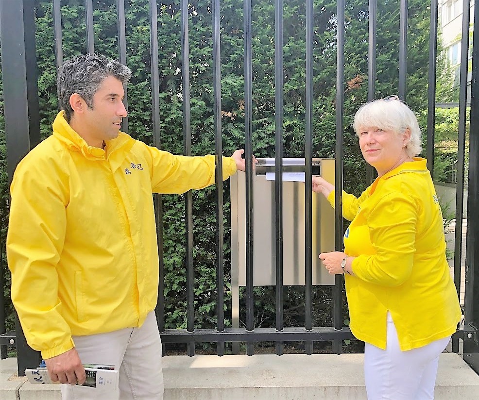 ![]() 图5:两位杜赛尔多夫的法轮功学员将劝善信投到中共领馆的信箱中。 |