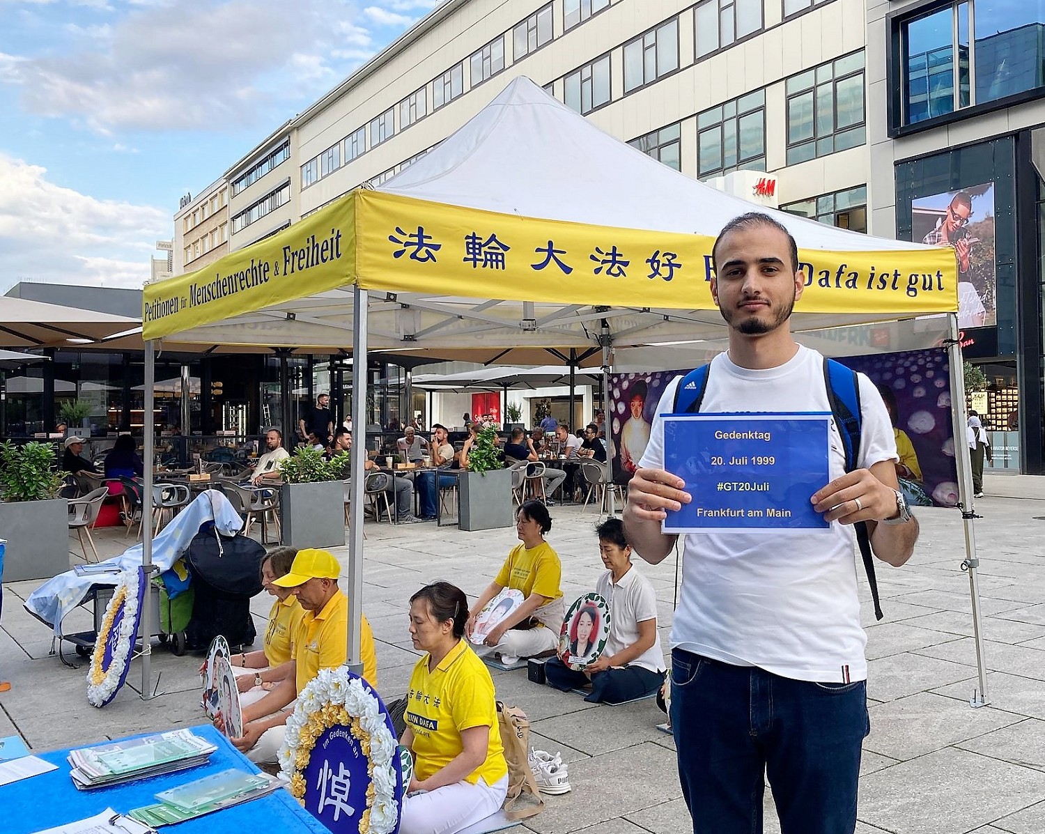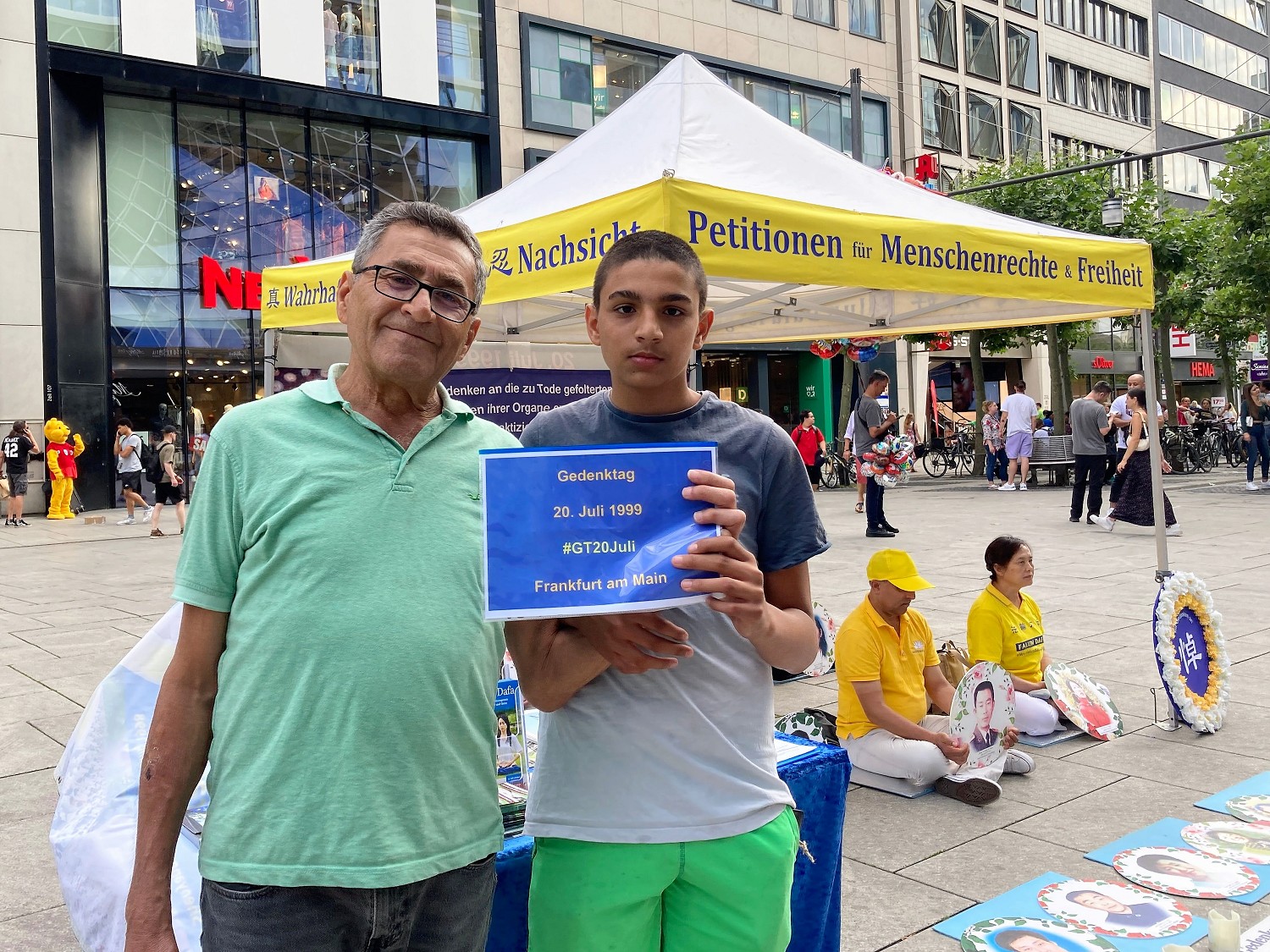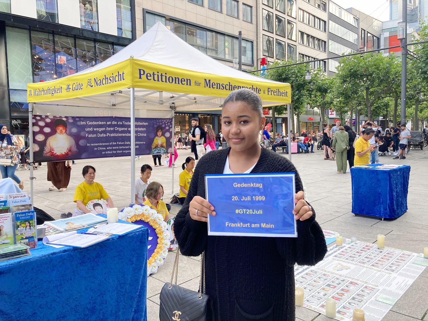在法兰克福的市中心,不少人向学员的活动投来好奇的目光。当了解到学员们是在揭露中共长达二十四年的迫害后,许多民众的表情立刻严肃起来,不时有人上前为反迫害签名。也有人举起了“悼念七·二零”的标语牌拍照,支持法轮功学员反迫害。