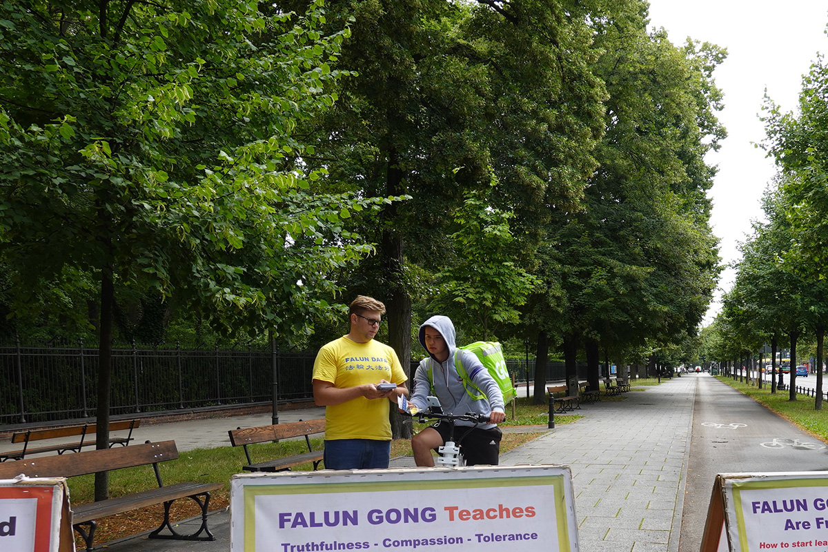 在集会现场,波兰著名电影摄影师、导演、制片人和编剧阿卡迪乌斯·戈勒比夫斯基(Arkadiusz Gołębiewski)先生刚好路过,他观看法轮功真相展板,为正在展示法轮功功法的学员们录影并仔细倾听法轮功学员的真相介绍。