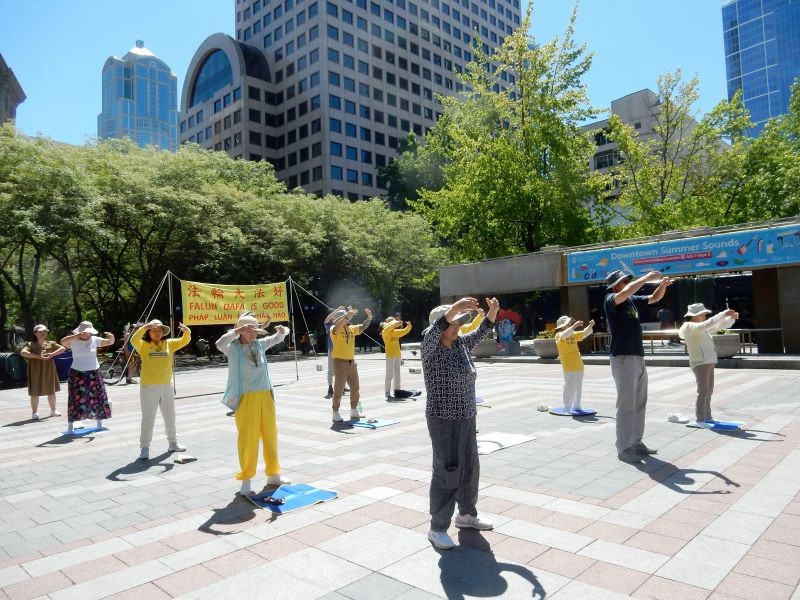 学员们展示祥和优美的五套功法,向路人发放真相资料,传播法轮大法的美好及中共迫害法轮功的真相。吸引民众纷纷停下匆忙的脚步向学员询问更多关于法轮功的讯息,有的想学炼功。