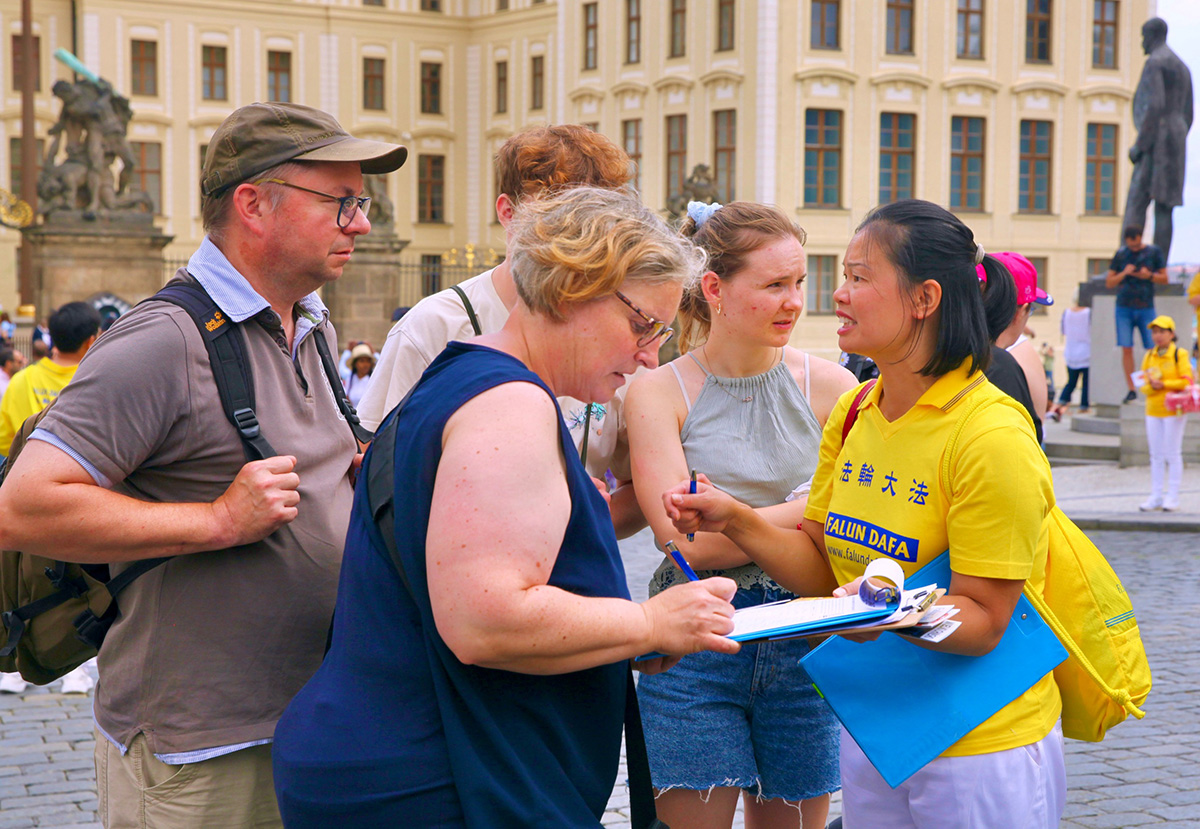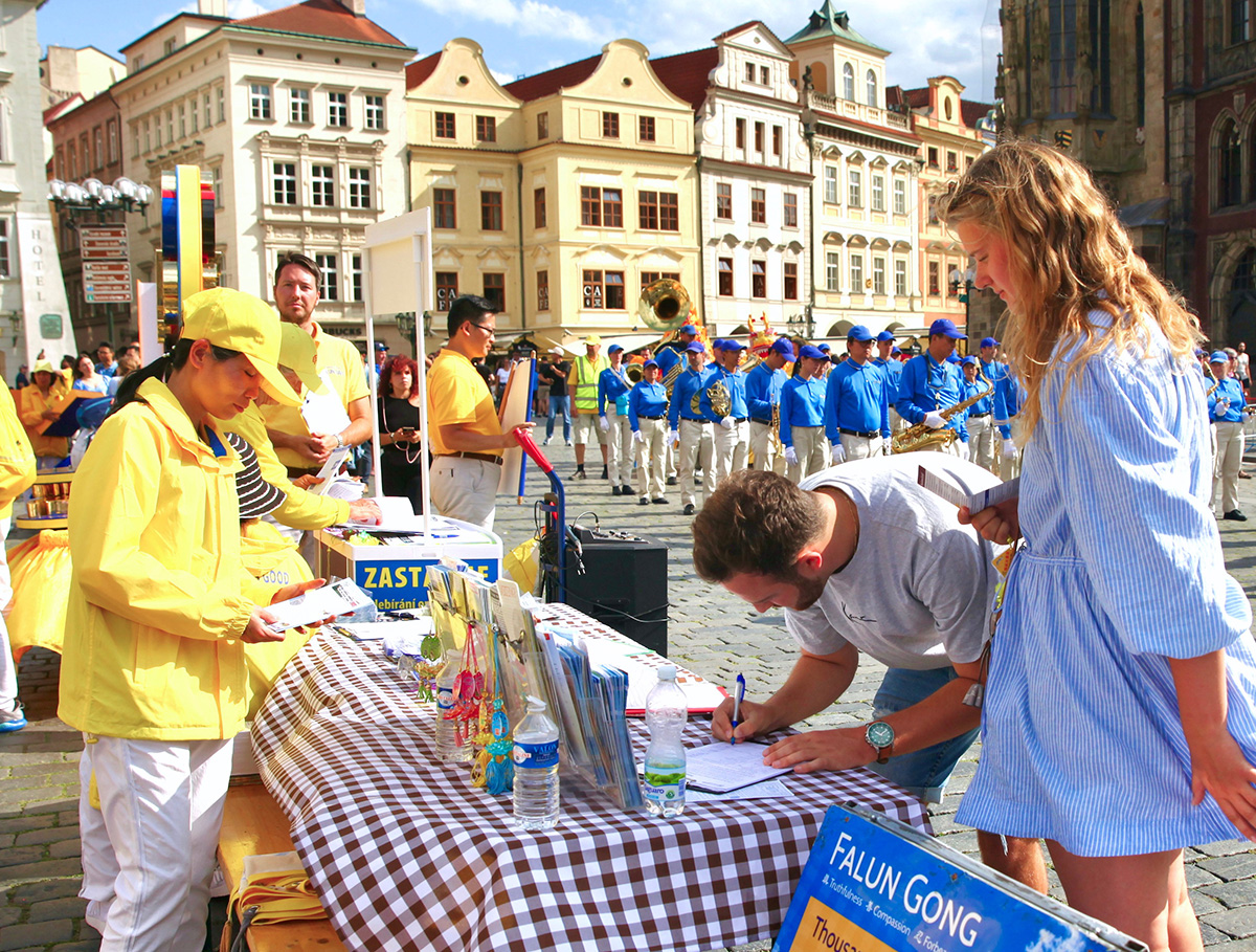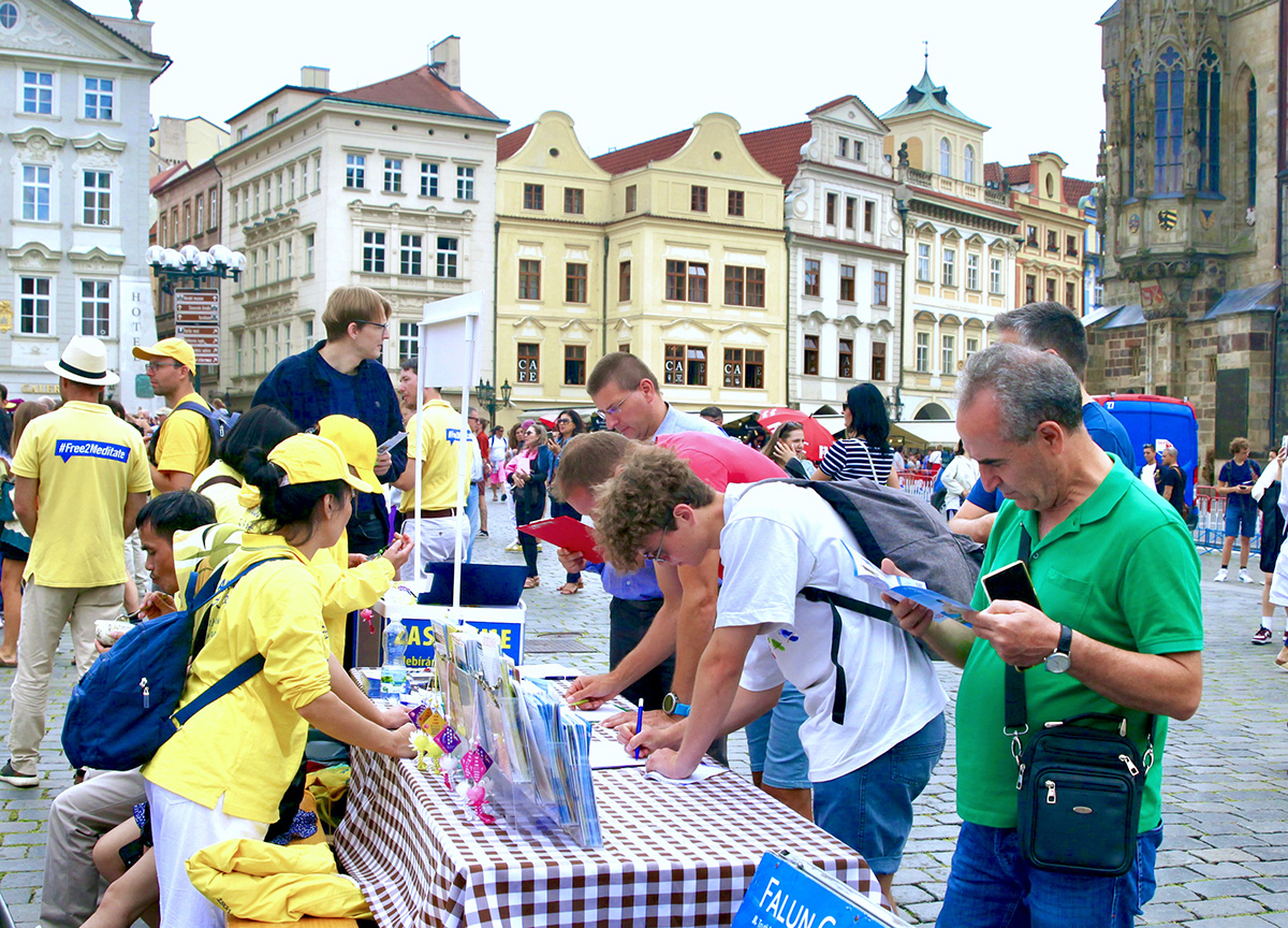 法轮功学员的集会游行活动当天,布拉格天气凉爽,游人如织。时逢中欧最大的民俗节在布拉格召开,来自世界二十多国五十多个团体也聚集在布拉格。法轮功学员的集会与游行都吸引了大量民众驻足观看。多国民众在了解了中共迫害法轮功的真相之后,纷纷签名声援法轮功学员反迫害。